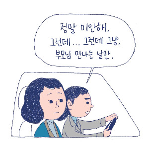 아니, 얘가 그 까짓돈 얼마나 번다고 일주일 내내. 애는 엄마아빠한테 맡기고 걱정입니다. 얼마 벌지도 못하는 돈 갖고 두 분 수고비도 드려야 하고, 회사도 왔다갔다하고 뭣하러 그런 고생을 사서 하는지. 얼른 둘째나 가질 것이지말입니다. 사돈댁도 **에서 딸 뒷바라지 하신다고 매주 이렇게 오르락내리락 하시는데 그게 어디 보통일입니까. 애는 엄마가 봐야지.