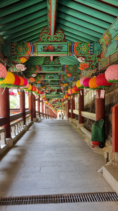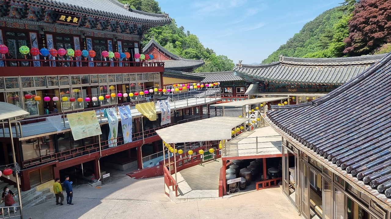 구인사는 소백산 구인사라는 말처럼 소백산 안쪽으로 줄지어 있는데, 올라가는 길 양 옆으로 부속 건물들이 자리를 하고 있다. 처음부터 계획을 갖고 지어진 것이 아니라 절을 찾는 사람들이 많아지면서 하나씩 중건하며 구조를 맞추지 않았을까 하는 생각이 들게 하는 모습이다.