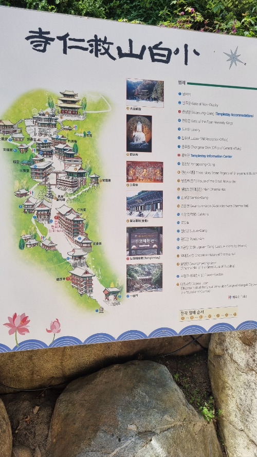 안내도를 보면 참배 순서를 알려주는데, 우리는 그냥 오른쪽 전각들을 보며 올라가면서 기도하고 왼쪽으로 내려오며 또 기도했다. 다른 절과는 다른 구인사만의 특징이 있는데, 그건 대웅전보다 규모가 큰 법당인 대조사전에 부처님 불상이 아니라 창건 스님의 좌상이 있다는 것이다. 부처님 불상을 모신 대웅전은 대조사전을 가기 전 중간쯤에 있다. 앞만 보고 대조사전까지 올라가 법당에 들어서는 순간 다른 절과는 다른 낯선 풍경을 마주하게 되는 것이다. 간단한 설명만 읽고는 정성스레 기도하고 나오니 법당 밖에 있던 보살님이 친절하게 설명해주신다. 그리고 스트레스가 많아 잠이 잘 안온다면 잠자리에 누워 '관세음보살'을 계속 읊어보라고 했다.