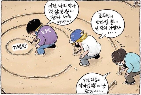 그러나 N번방은 결코 빈 땅에서 태어난, 새로운 세대의 새로운 범죄가 아니다. 그동안 계속해서 이어져왔던 성폭력과 성착취가 기술의 발전을 통해 새로운 형태를 취하게 되었을 뿐이다. 우리의 일상과는 관계없이 일어난 악마의 범죄인 것도 아니다. 여성을 성적 대상화하여 희롱하는 것이 만연했던 사회는 이미 그 자체로 충분한 토양이 되어주었다. 각종 성범죄를 강력하게 처벌하지 않았던, 직장에서 빈번하게 일어나는 성폭력을 묵인했던, 성매매 행위에 가담하는 것으로 의리를 쌓았던, 철저히 일방적인 포르노를 소비하고 불법 촬영된 성관계 영상을 공유했던 모두가 지금의 N번방을 만들었다. 조주빈을 '악마'로 지칭하고 그의 개인사를 통해 그가 왜 악마가 되었는지에만 주목하는 일부 언론이, 가해자의 '창창한 미래'를 망가뜨리지 않기 위해 처벌 수위를 낮추는 법정이, 총선을 앞두고 거대한 표심을 잃을까 우려한 탓인지 호기심을 운운하는 국회의원이 여전히 진짜 문제를 가리고 서있다.