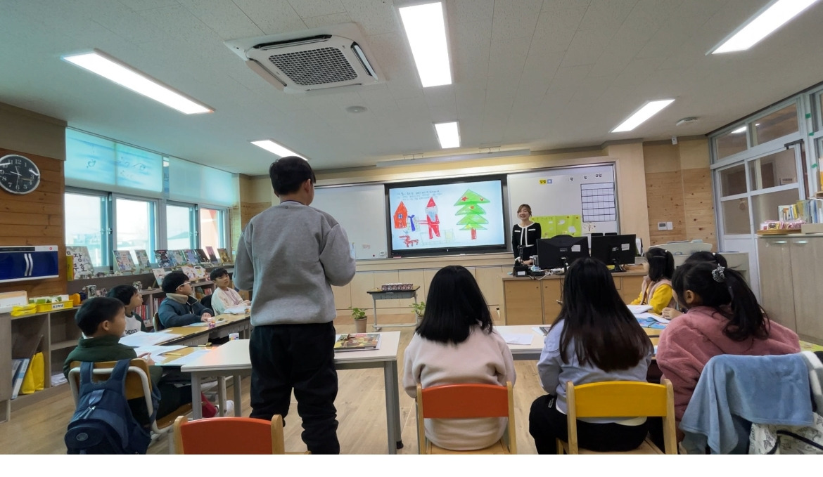 자신이 그린 그림이 화면에 나오면 자리에서 일어나 큰 소리로 이야기를 낭독한다.