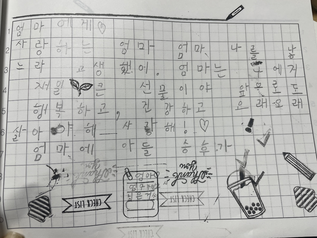내가 아이의 편지에 늘 써주는 표현인데 그 문장을 아이가 똑같이 쓴다.