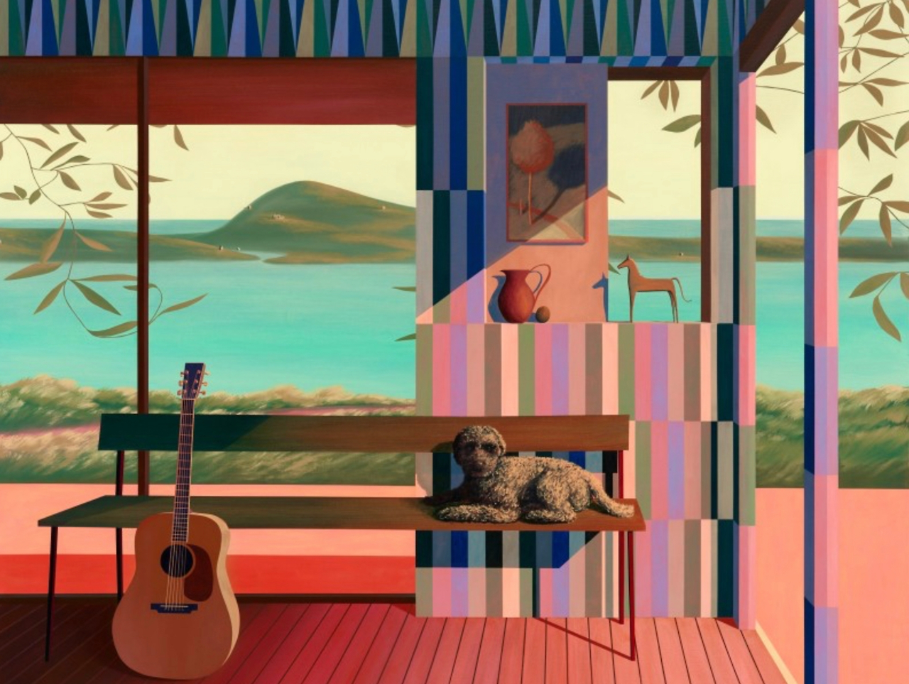 작가 알피 케인은 공간 전문 작가로 불려도 될 만큼 건축이나 인테리어적인 요소들을 가득 품은 그림을 그린다. 실제로 건축학을 전공했다는 사실을 알고 나면, 그럴 줄 알았어…라고 고개를 끄덕이게 되는 그의 그림들을 유심히 바라보면, 고요한 순간이 엄습해 온다. 풍부한 색감이 돋보이는 점에서 같은 영국 출신인 호크니를 연상케 하기도 하지만, 그의 그림은 좀 더 내밀한 느낌이다. 줄무늬 패턴의 벽지 앞 의자에 기댄 기타 뒤로 잔잔하게 펼쳐지는 호수와 산의 풍경이라든지, 반려견을 쓰다듬으며 휴대폰을 보며 누워있는 남자의 시간보다 더 여유로워 보이는 노을빛 풍경은 우리의 마음을 조용히 진정시킨다. 건축학도 출신답게 집안의 오브제들을 디테일하게 표현했지만, 그런 것보다 더 눈에 들어오는 것은 집을 둘러싼 풍경들이다. 외부의 전망까지 집안으로 끌고 들어와 또 다른 세상과 분위기로 확장되는 느낌. 집을 둘러싼 환경까지도 집의 일부인 셈이라고 작가는 말하는 것 같다. 그는 인터뷰에서 “저는 사람들이 제 작품의 공간에서 실제 거주할 수 있다는 환상을 갖길 원하지만, 동시에 이 공간들은 초현실적으로 무형이며 이상화된 세계이기도 합니다. 제가 그리는 이 공간들이 잠시나마 현실을 대신하며 일상으로부터의 정신적 탈출구가 되기를 바랍니다.”라고 했다. 그의 말처럼 집은 단순히 잠을 자고 식사를 해결하는 물리적인 공간을 넘어서 정신적인 차원으로 안내하는 세상이다.