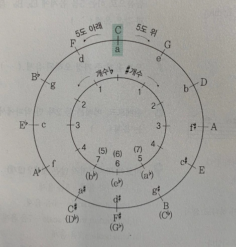 모차르트가 수학을 잘해서 우리를 감동시키는 음악을 작곡했다고 생각하고 싶지는 않다. 모차르트를 비롯한 음악가들에게는 본능적인 감각과 특별한 능력이 있어 수많은 명곡들이 세상에 나왔다고 믿고 싶다. 수학이나 과학의 발전이 음악에 기여했지만, 음악은 수학도, 과학도 아닌 음악이잖아요. 그러나 내가 아무리 거부하고 싶어도 음악은 논리적이다. 모차르트 소나타를 연주하다 보면, 뭔가 수학이나 과학에나 나올 법한 규칙들이 끊임없이 등장하기 때문이다. 예를 들어 지난 수업 시간에 선생님이 설명하신 circle of fifths, 우리말로는 5도권이라는 것이 그렇다. 조의 근친 관계가 5도로 형성되는 것을 원형 및 그 밖의 형태로 나타낸 것을 말하는데, 우리가 그나마 기억하는 5도권은 C를 기준으로 # 샵이 붙는 순서, 파도솔레라미시, b 플랫이 붙는 순서 시미라레솔도파로 외웠던 조(key)와 관련된 이야기다. 그렇게 오른쪽, 왼쪽으로 원을 그리며 돌아가면 결국 12개의 음이 반복된다. 소나타 12번, 1악장의 60번째 마디의 왼손의 흐름이 이 5도권의 순서대로 움직이고 있는데, 사실 이 부분을 제일 좋아하기도 해서 더 흥미로웠다. 이런 식의 흐름에 끌리는 이유는 듣기 좋은 진동수의 비율과 진행이 존재하기 때문일 것이다. 이런 과학의 논리는 머리로 이해가 되지 않아도, 음악의 논리는 마음으로 이해가 된다고 믿으며 책을 한 장 한 장 넘긴다.
