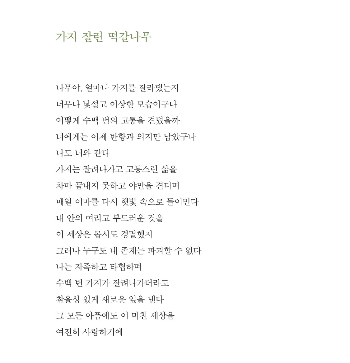 하지만 누구도 내 존재를 파괴할 수 없다며 수백 번의 아픔에도 끊임없이 새로운 잎을 낸다는 의지를 보았을 때는 처음 떠올렸던 가지가 잘려 휑한 나무와는 너무나도 다른 모습의 나무가 떠올라 마음속에 간질간질 새 잎이 차오르는 느낌이었다.