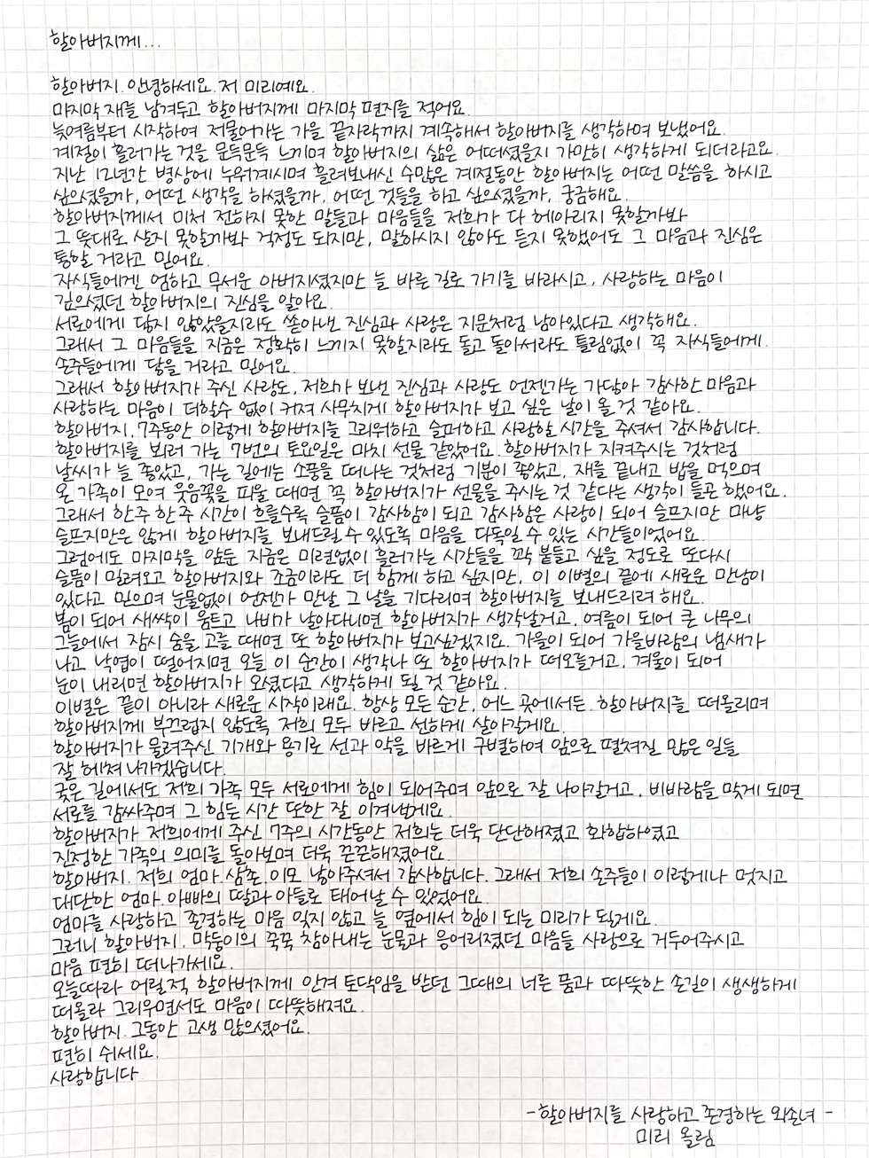 이별은 끝이 아니라 새로운 시작이래요. 항상 모든 순간, 어느 곳에서든 할아버지를 떠올리며 할아버지께 부끄럽지 않도록 저희 모두 바르고 선하게 살아갈게요.
