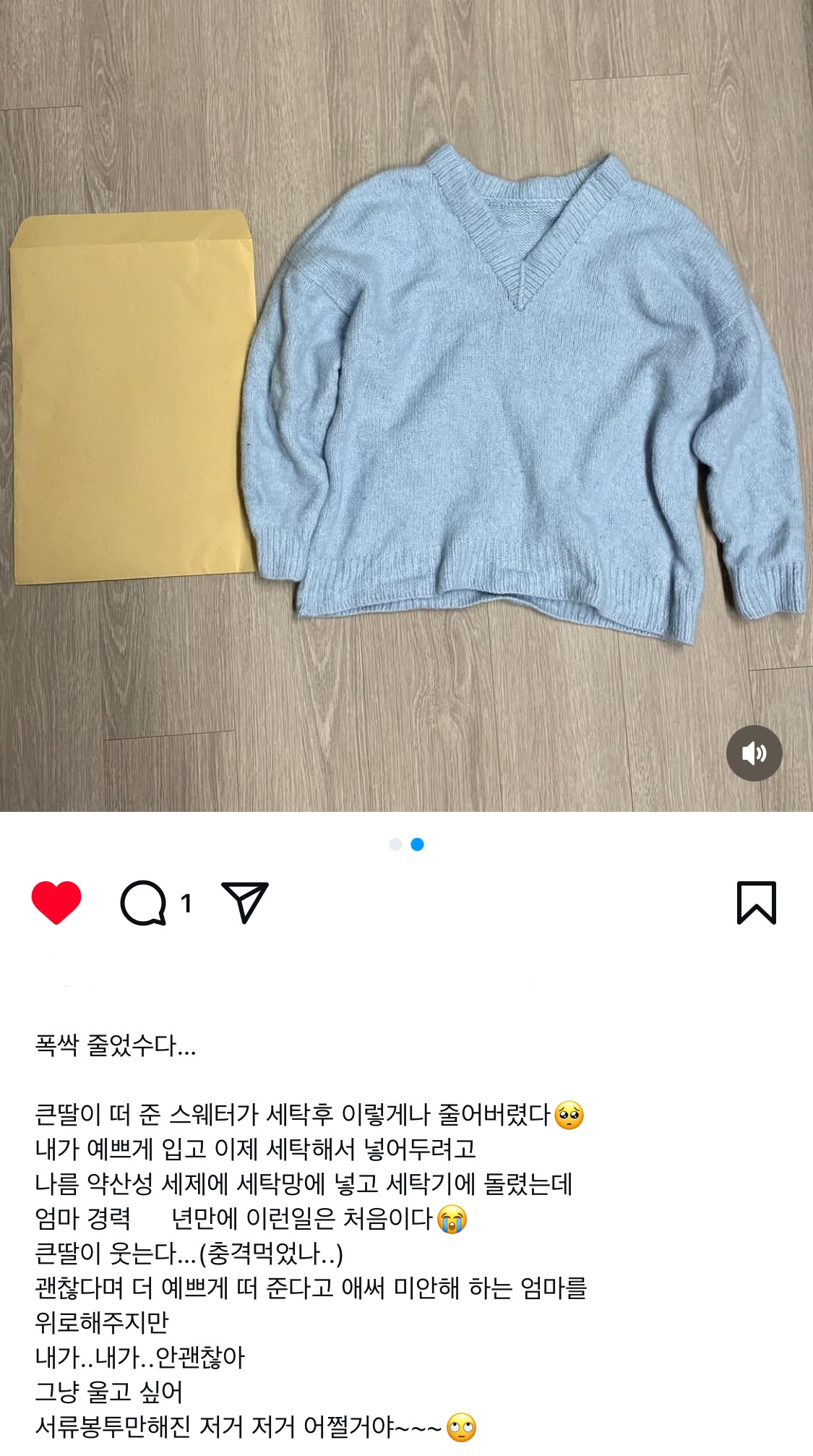 애착 스웨터가 아동복이 되는 매직을 겪고 엄마는 충격에서 헤어 나오질 못하고 있다.