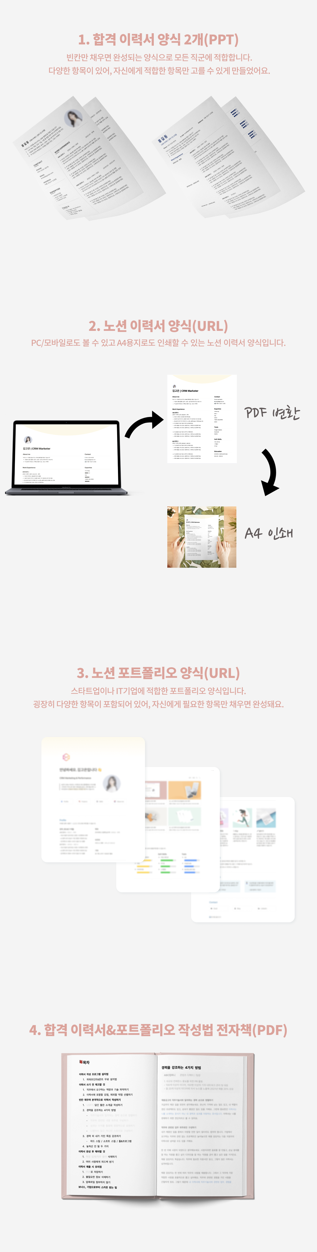 이력서는 PPT와 노션으로 나에게 필요한 항목만 골라쓸 수 있도록, 다양한 내용이 포함되어 있어요. 전 직군에서 쓰실 수 있습니다 :)