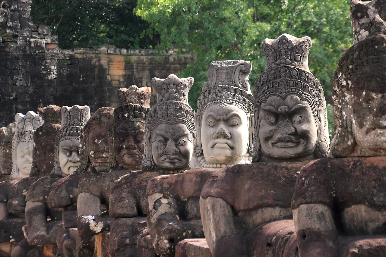 다리 왼편에는 '수라(sura)' 또는 '데바(deva)'로 불리는 선한 신 쉰넷, 오른편에는 악한 신 '아수라(asura)' 쉰넷, 합쳐서 백팔 기의 거대한 조각상들이 서 있었다. 이들은 두꺼운 뱀 ‘바수키(Vāsuki)’를 양손으로 받쳐 들고 마치 줄다리기를 하듯 안간힘을 쓰면서 힌두교의 창조 신화 '젖의 바다 휘젓기(乳海攪拌)'를 재현하고 있었다. 그 길 한가운데에 서니 줄다리기의 소실점이 만나는 가운데에 앙코르 톰의 남문, 고푸라가 웅장하게 서 있었다. 문을 지나면 마치 그 창조 신화의 원초성 한가운데로 들어갈 것만 같은 기분이 들었다.