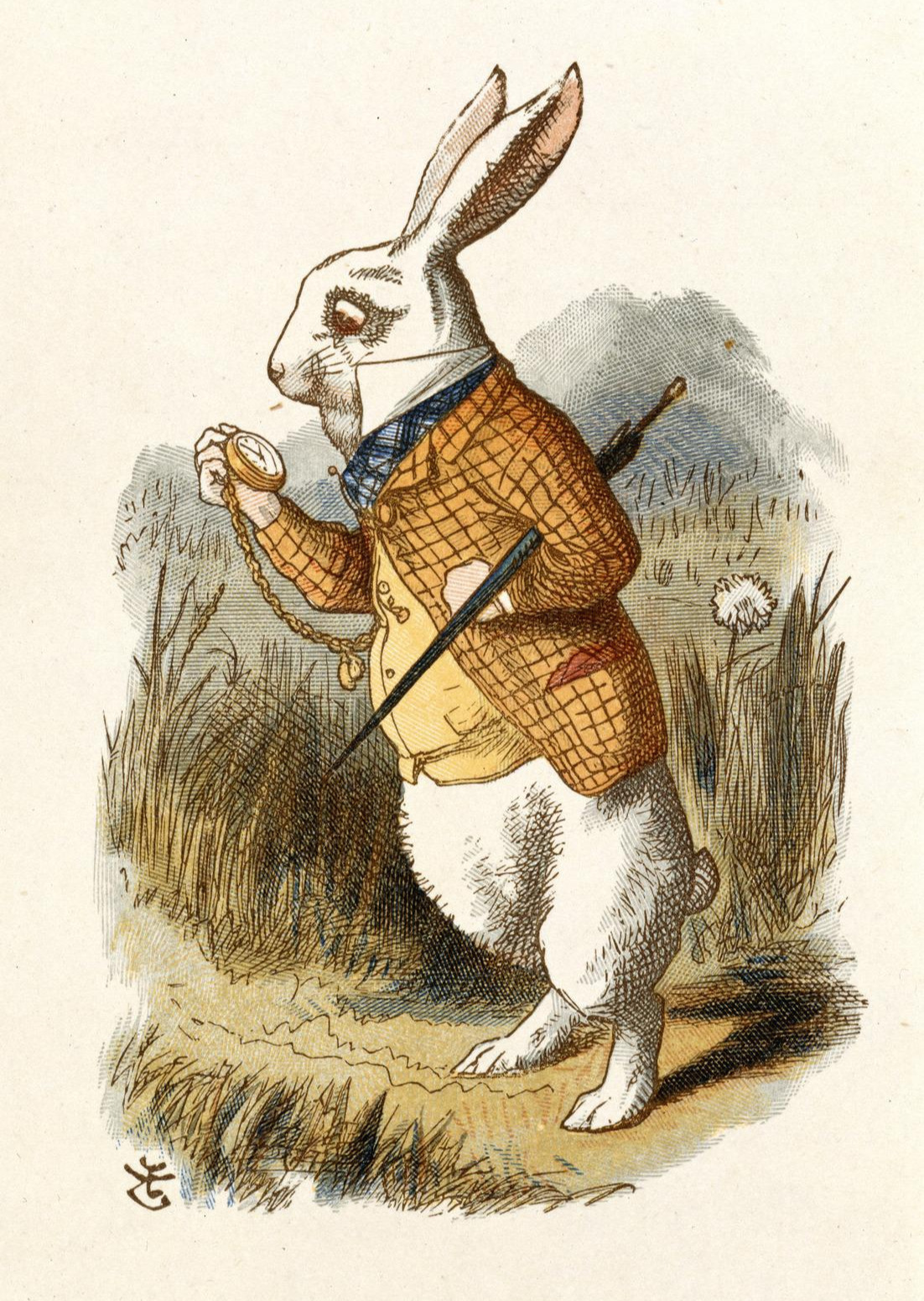 그때 갑자기 분홍색 눈을 한 하얀 토끼가 앨리스 쪽으로 뛰어왔다. 아주 특별히 이상할 건 없었다. 앨리스는 토끼가 “아, 세상에! 세상에! 이러다 늦겠어!”라고 중얼거리는 소리를 듣긴 했지만 그렇게 특별히 이상할 건 없다고 생각했다. (중략) 토끼가 급기야 양복 조끼 주머니에서 시계를 꺼내더니, 시간을 확인하고 급하게 달려가자 앨리스도 뛰기 시작했다. 토끼가 양복 조끼를 입고 있는 모습이나 조끼 주머니에서 시계를 꺼내는 모습이나 모두 처음 보는 것이라는 사실을 문득 깨달았기 때문이었다. 궁금함을 참지 못한 앨리스는 들판을 가로질러 토끼를 쫓아갔고, 이내 토끼가 산울타리 아래 커다란 토끼 굴 속으로 폴짝 뛰어 들어가는 것을 보고야 말았다.