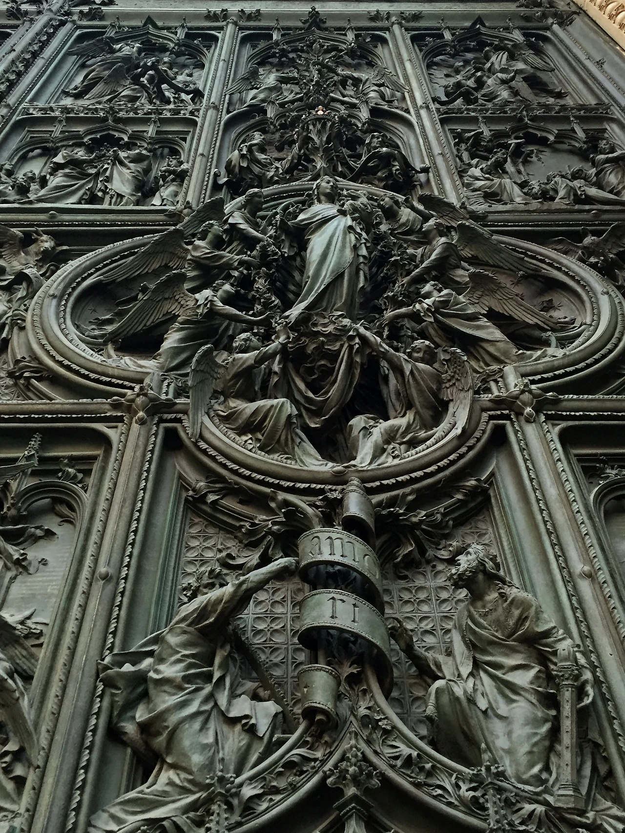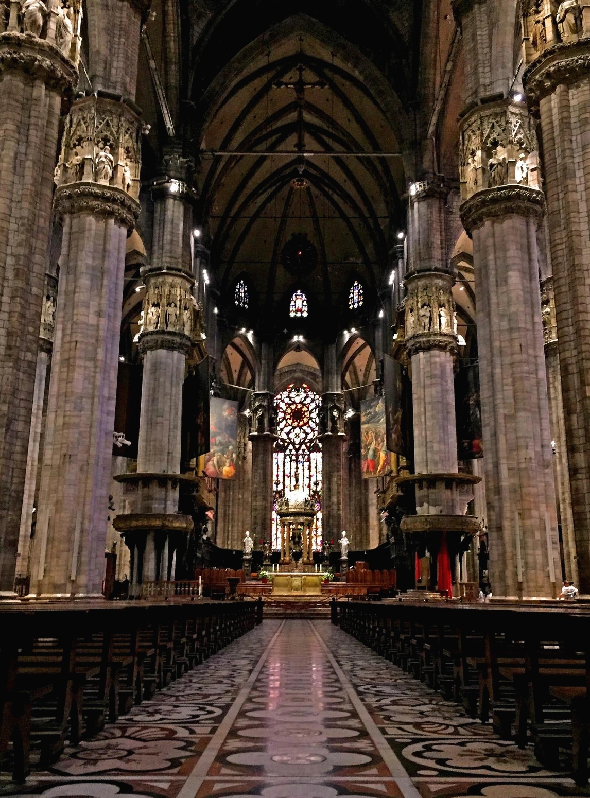 성경의 수많은 이야기가 새겨진 청동 문을 지나 어두운 건물 안으로 들어갔다. 뒤에서 육중한 문이 둔탁하게 닫히는 순간 주위가 갑자기 음소거되었다. 광장의 시끄러운 소리는 두꺼운 벽에 가로막혔는지, 끌리는 발소리조차 크게 들려왔다. 방금 전까지만 해도 귀를 따갑게 했던 광장의 소음과 대비되는 신성한 음악을 들으며 장의자에 앉아있는 동안, 장미 창의 화려한 스테인드글라스를 뚫고 들어온 영롱한 빛으로 마음속까지 거룩함이 채워지는 것 같았다. 중세 시대 사람들도 나처럼 성당에 들어올 때마다 시간과 공간을 일순간 뛰어넘어 천상의 신비를 일부 맛보았으리라.