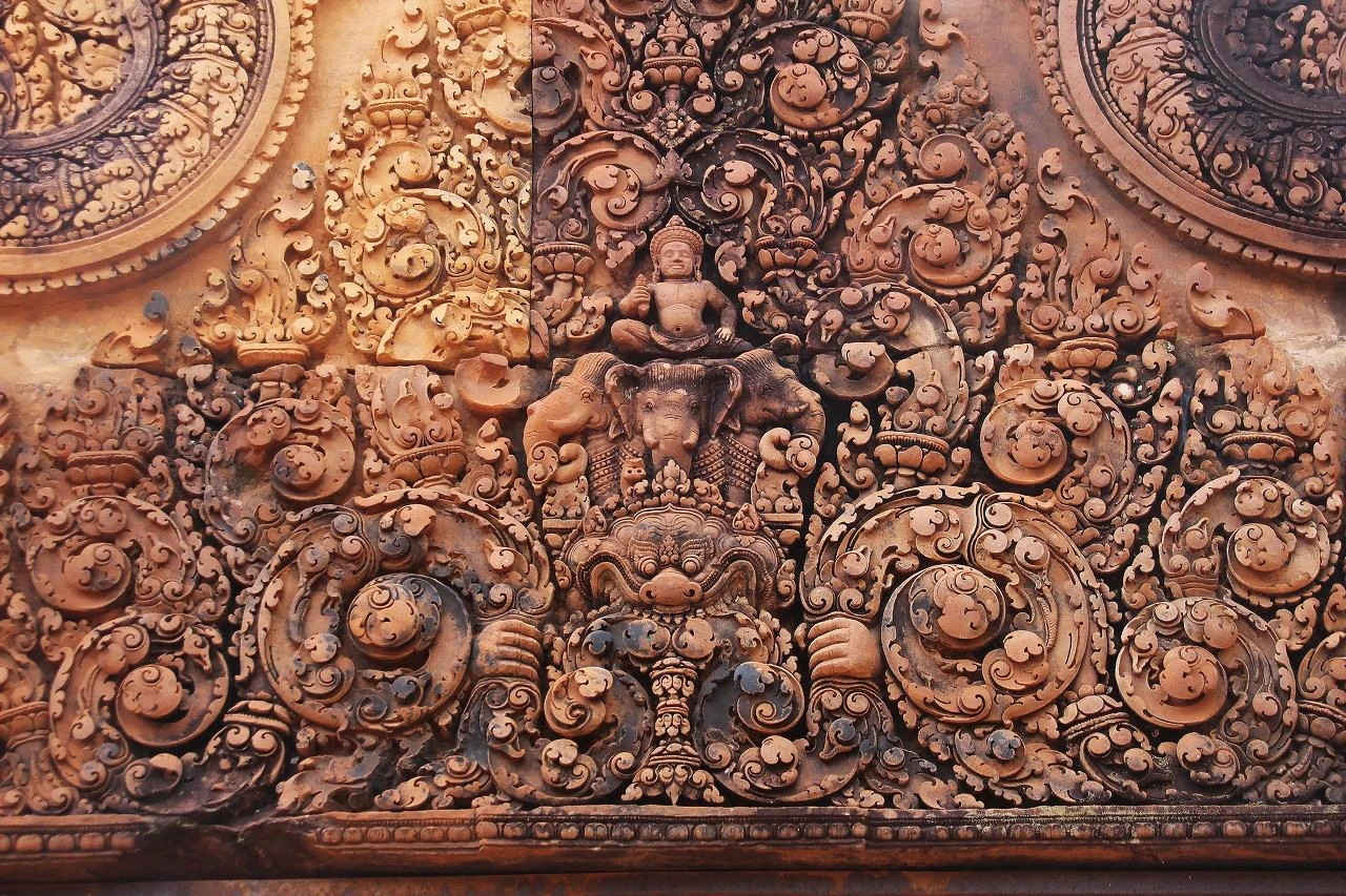 한낮의 반테아이 스레이 사원은 선명한 붉은빛이 났다. 붉은 사암으로 지어져 다른 유적의 검은 사암과 확연히 다른 인상을 받았다. 우아한 부조가 특징이라는 가이드의 설명을 따라 부조를 천천히 감상하며 사원 안쪽으로 들어갔다. 출입구 기둥 위에서 안정적으로 문을 지탱하게 해주는 린텔(Lintel, 상입방) 세밀한 조각을 넋을 잃고 보다가 기둥을 손으로 짚으며 지나가려던 차, 손가락 끝에 만져지는 무언가를 확인해 보고는 갑자기 얼어붙었다.