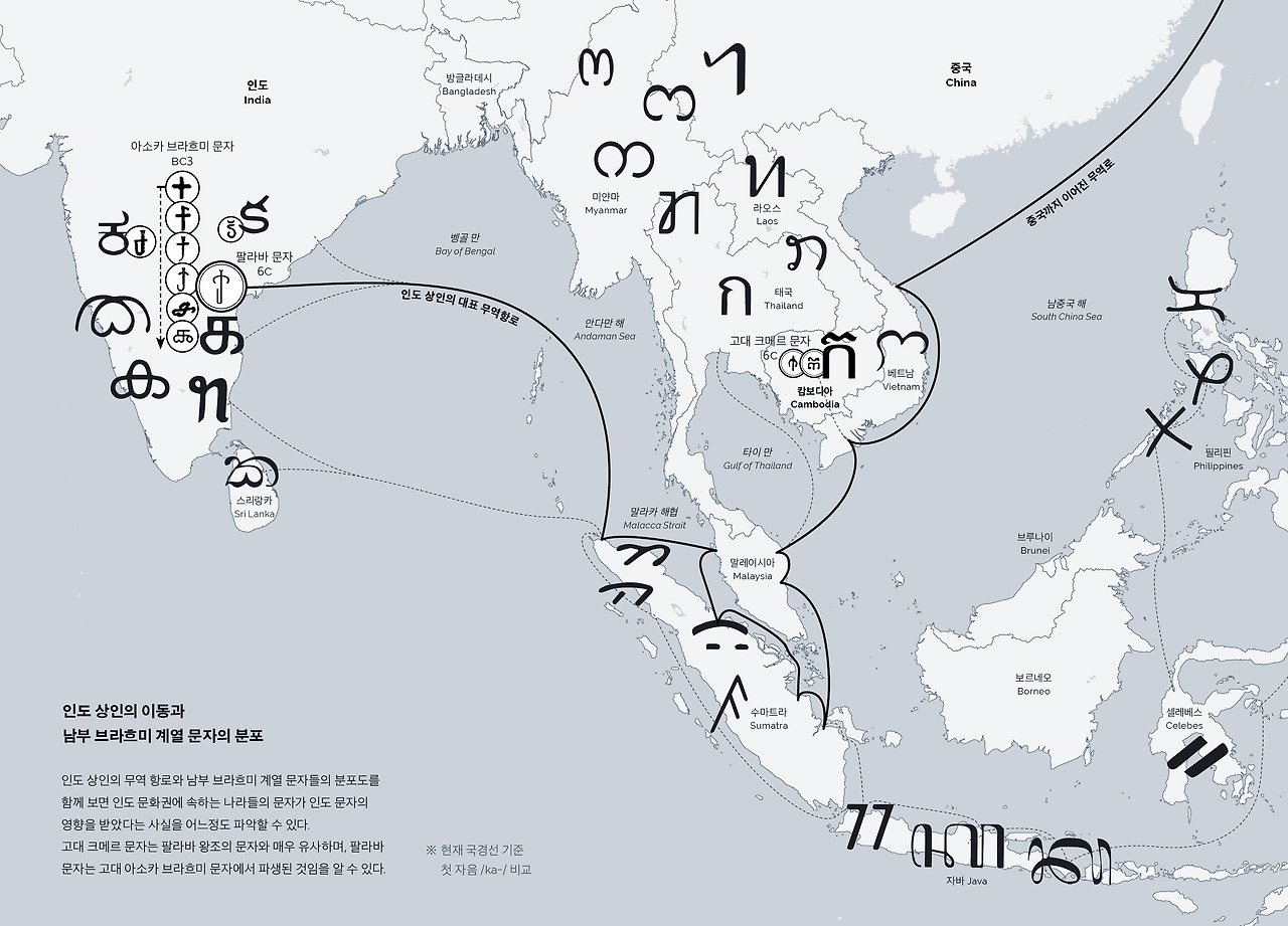 자료를 찾다보니 크메르 문자의 기원은 인도였다. 고대 인도, 특히 남인도 지역의 여러 왕국은 벵골 만(Bay of Bengal)을 거쳐 안다만 해(Andaman Sea), 말라카 해협(Malacca Strait), 타이 만(Bay of Thai), 남중국 해(South China Sea)를 지나 중국까지 무역 활동을 했다. 인도에서 출발한 배에는 상인뿐 아니라 인도의 발달된 사회 제도와 종교를 익힌 인도의 사제 계급 브라만(Brahman)과 새로운 문화를 알고자 하는 귀족 계급 크샤트리아(Kshatriya)도 다수 포함되어 있었다. 동남아시아 전역의 여러 왕들이 상인들과 함께 들어온 브라만, 귀족들을 초청해 인도의 종교와 사회 제도를 배웠다. 그 과정에서 인도의 문자가 동남아시아에 골고루 퍼진 것이다.