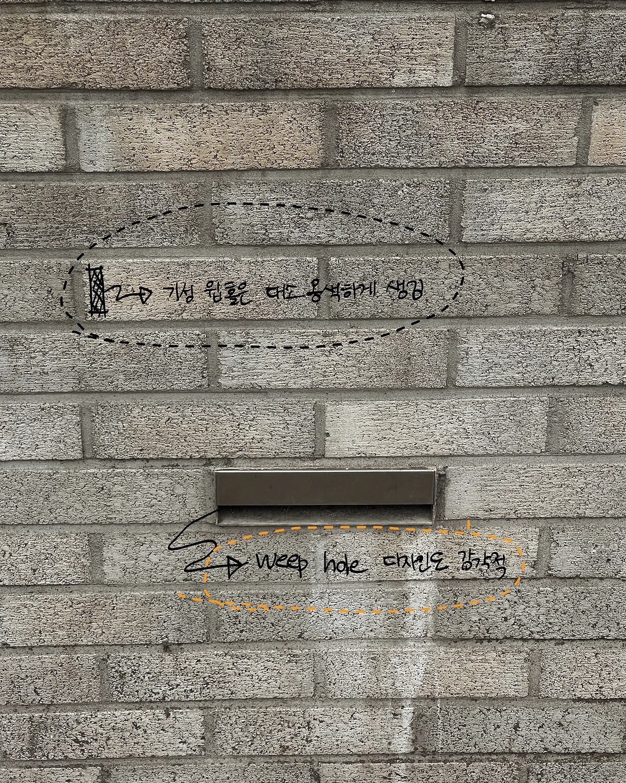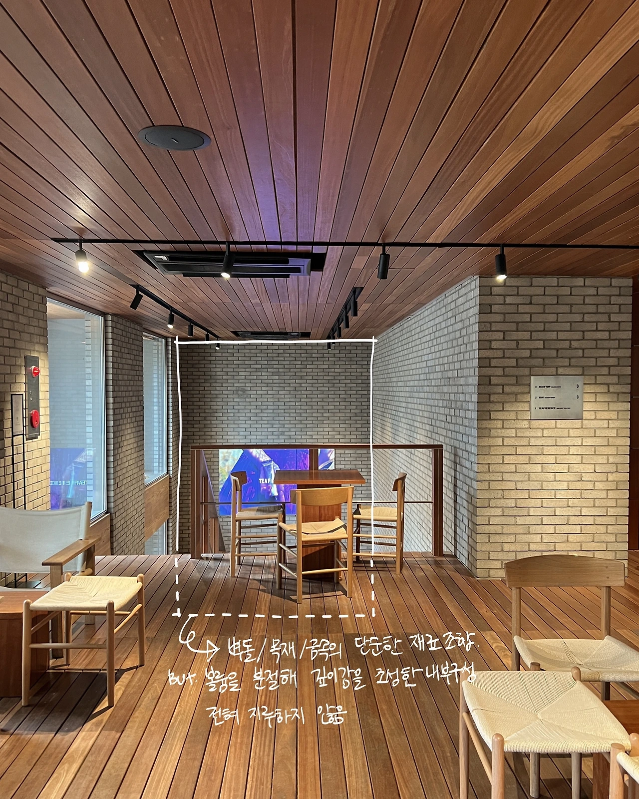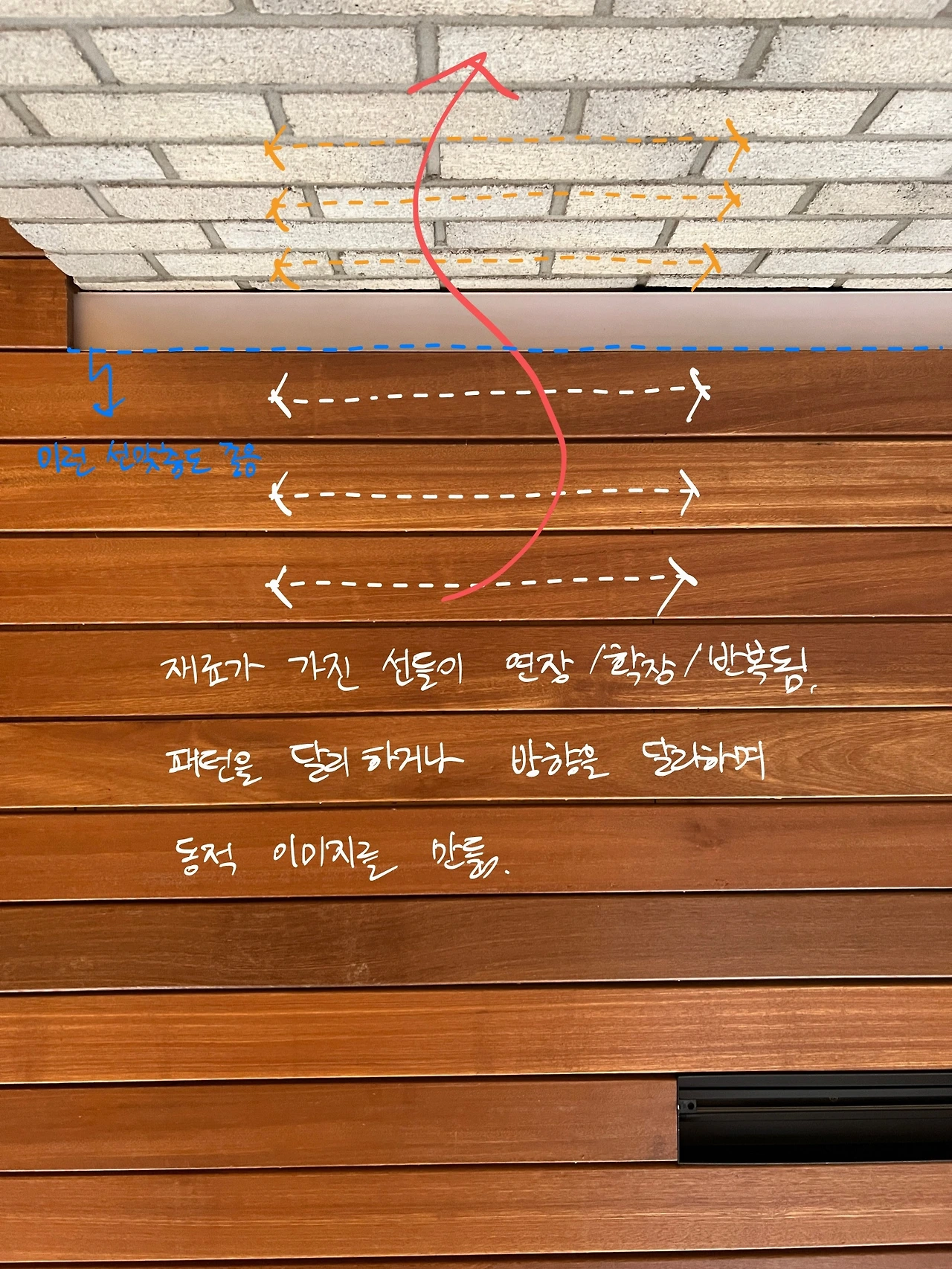 벽돌과 목재를 반복해 사용하면서 가로, 세로 패턴을 달리 하거나 떨어진 선들이 각자의 위치에서 확장성을 가지고 뭉툭한 덩어리로 보일 만한 면들을 선 하나로 날렵하게 만드는 기술적 지혜에 감탄할 수밖에 없다.