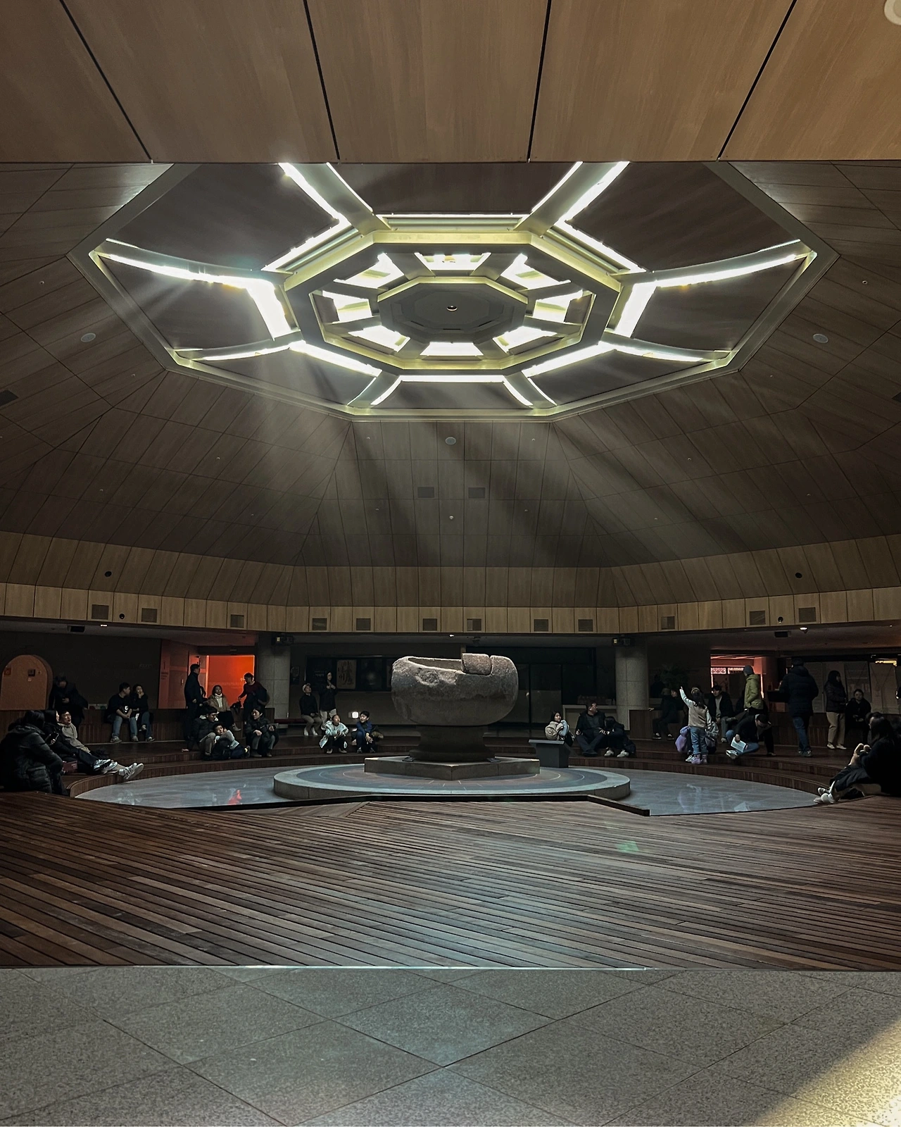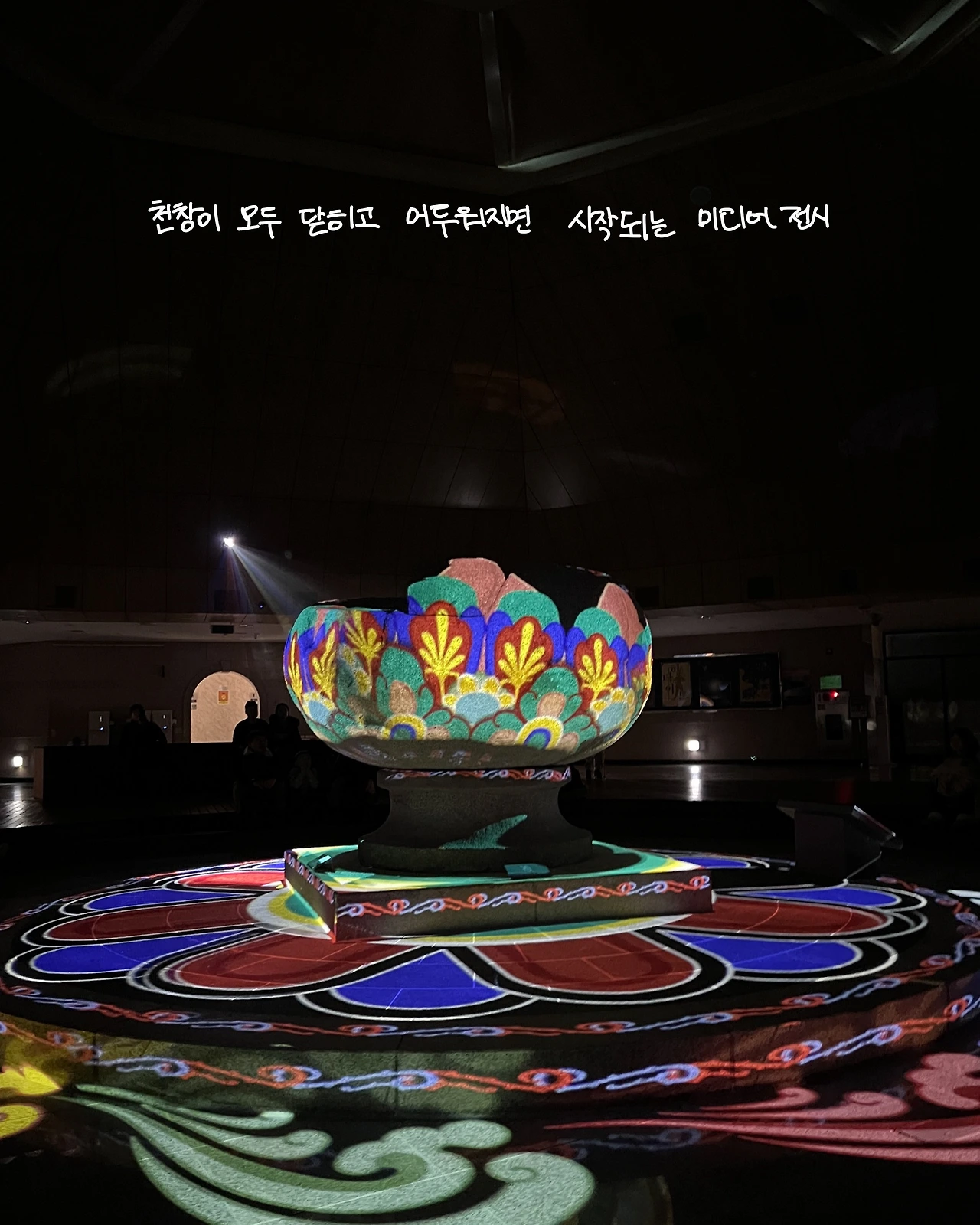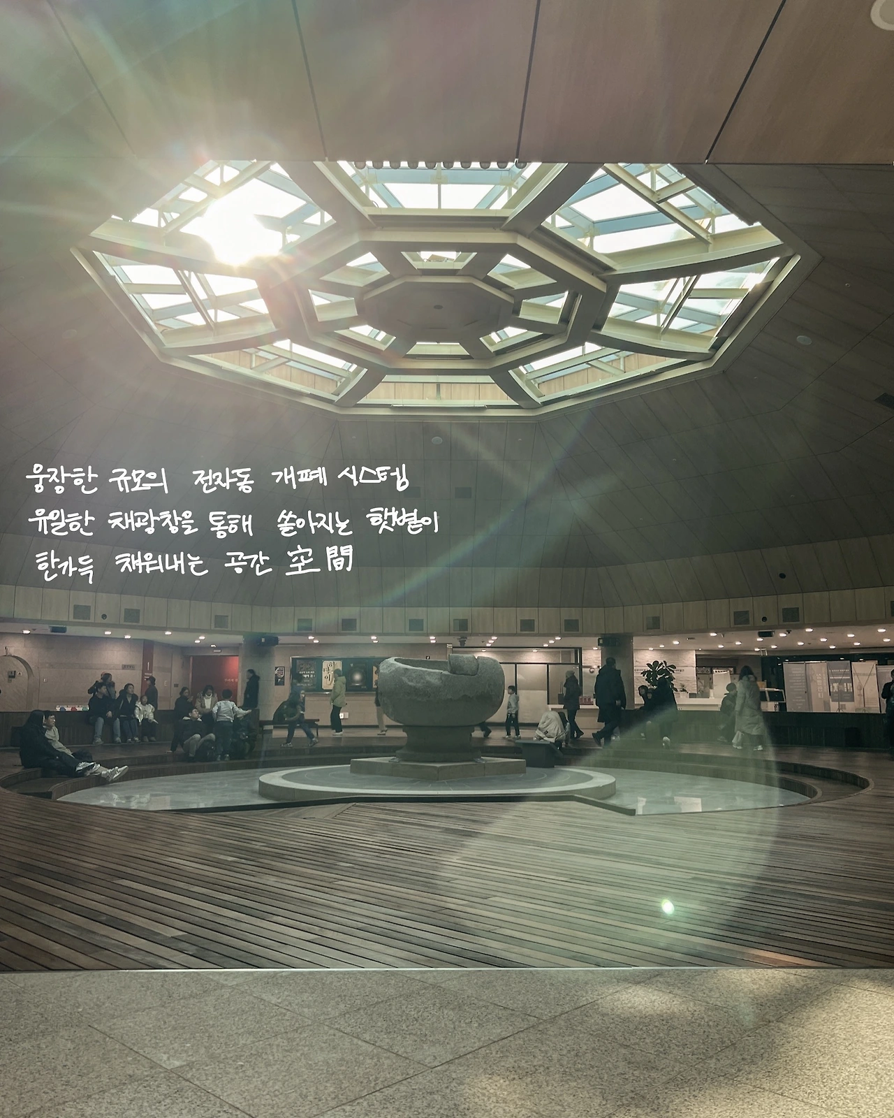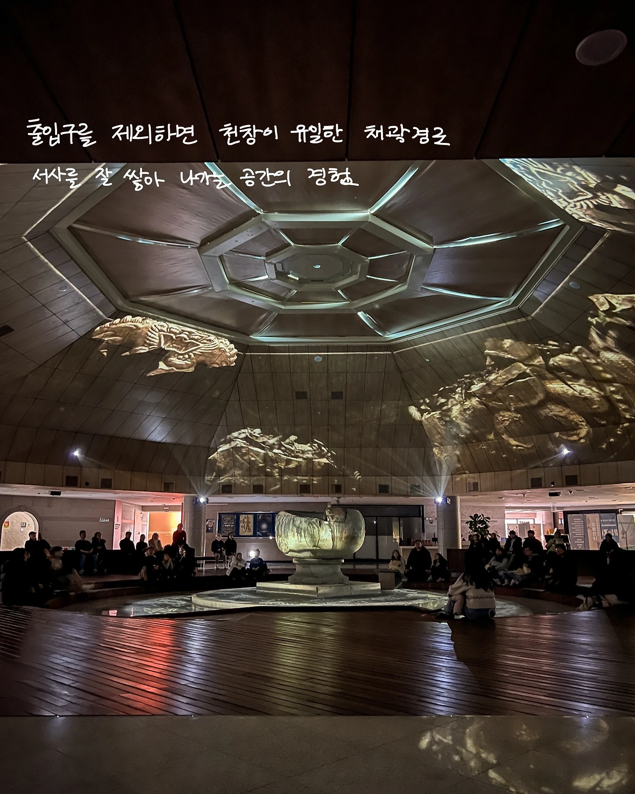천창을 닫아 공간이 어둠으로 가득 차면 미디어 전시를 보기 위해 빙 둘러앉아 건물 안의 광장을 이용한다는 점이 인상적이었다.