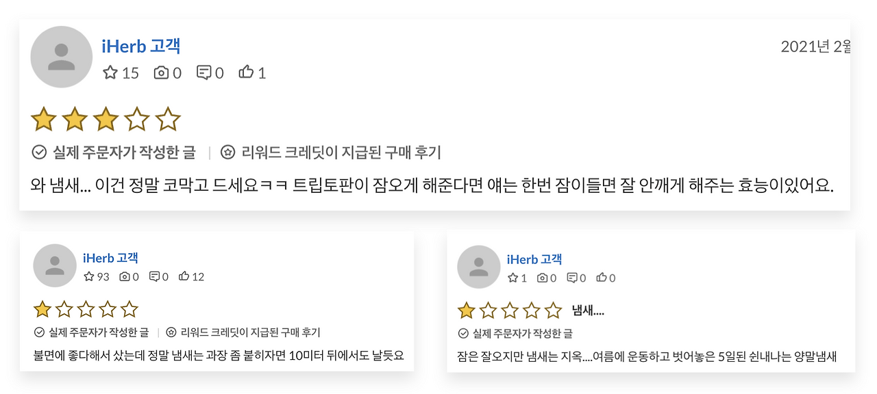 아이허브나 다양한 곳에서 나타나는 개개인의 부작용들을 보면 저처럼 두통이 있거나, 자다가 깨거나, 꿈이 너무 선명한 점이 불편하다는 이야기가 꽤 있는데요. 그런데 또 어떤 리뷰에서는 효과 있다! 이런 말들도 있다 보니 아무래도 개개인차가 큰 것 같습니다. (정량보다는 용량을 조금 더 조절하면 부작용은 확실히 없었어요.)
