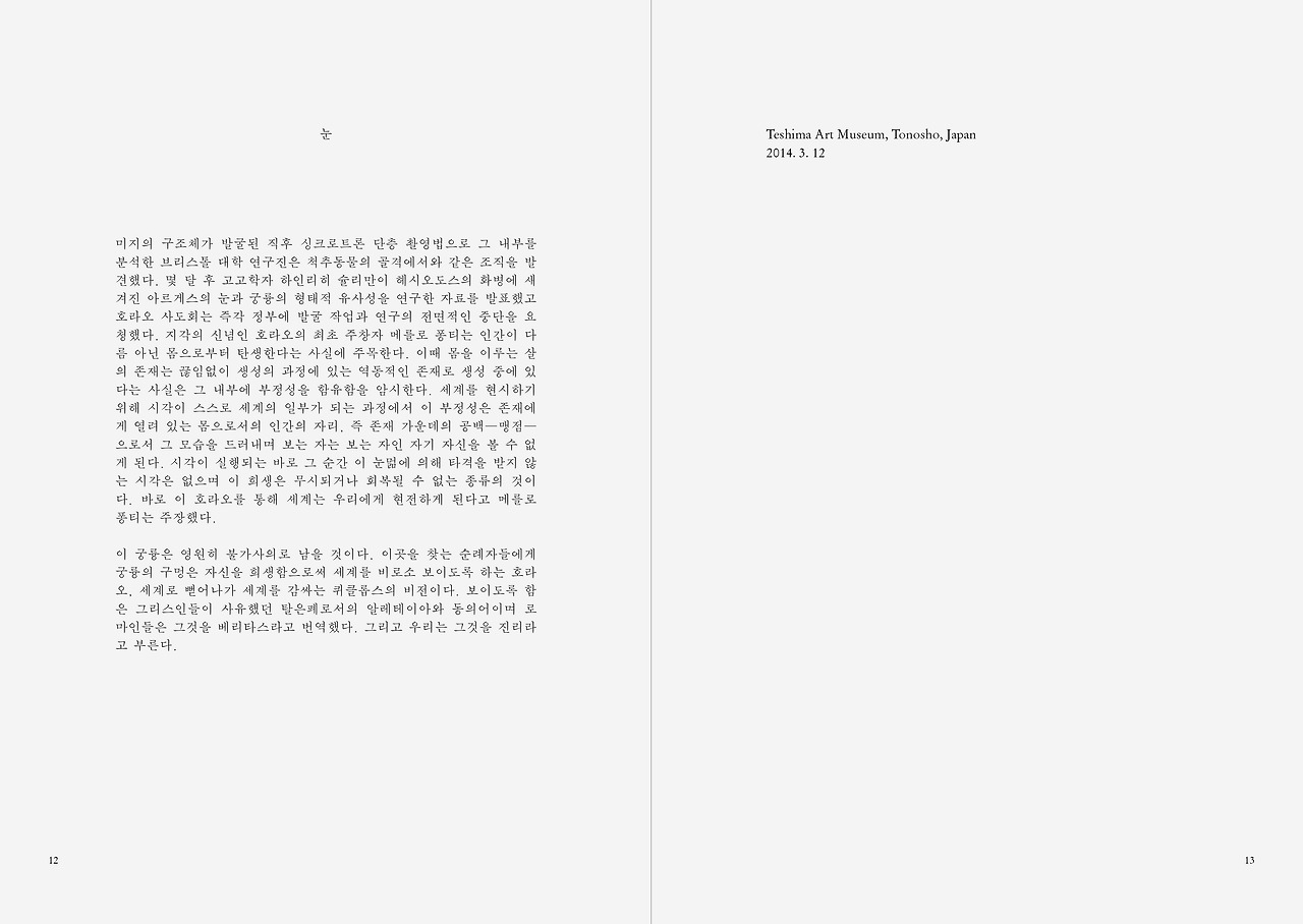 이 궁륭은 영원히 불가사의로 남을 것이다. 이곳을 찾는 순례자들에게 궁륭의 구멍은 자신을 희생함으로써 세계를 비로소 보이도록 하는 호라오, 세계로 뻗어나가 세계를 감싸는 퀴클롭스의 비전이다. 보이도록 함은 그리스인들이 사유했던 탈은폐로서의 알레테이아와 동의어이며 로마인들은 그것을 베리타스라고 번역했다. 그리고 우리는 그것을 진리라고 부른다.