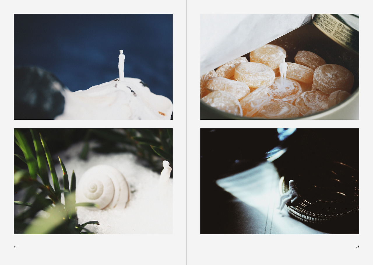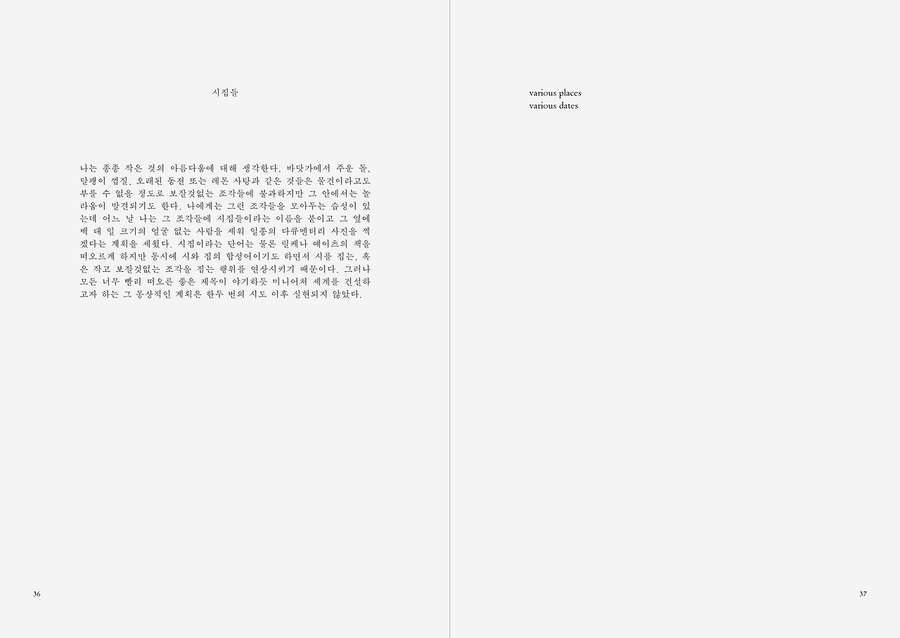 나는 종종 작은 것의 아름다움에 대해 생각한다. 바닷가에서 주운 돌, 달팽이 껍질, 오래된 동전 또는 레몬 사탕과 같은 것들은 물건이라고도 부를 수 없을 정도로 보잘것없는 조각들에 불과하지만 그 안에서는 놀라움이 발견되기도 한다. 나에게는 그런 조각들을 모아두는 습성이 있는데 어느 날 나는 그 조각들에 시집들이라는 이름을 붙이고 그 옆에 백 대 일 크기의 얼굴 없는 사람을 세워 일종의 다큐멘터리 사진을 찍겠다는 계획을 세웠다. 시집이라는 단어는 물론 릴케나 예이츠의 책을 떠오르게 하지만 동시에 시와 집의 합성어이기도 하면서 시를 집는, 혹은 작고 보잘것없는 조각을 집는 행위를 연상시키기 때문이다. 그러나 모든 너무 빨리 떠오른 좋은 제목이 야기하듯 미니어처 세계를 건설하고자 하는 그 몽상적인 계획은 한두 번의 시도 이후 실현되지 않았다.