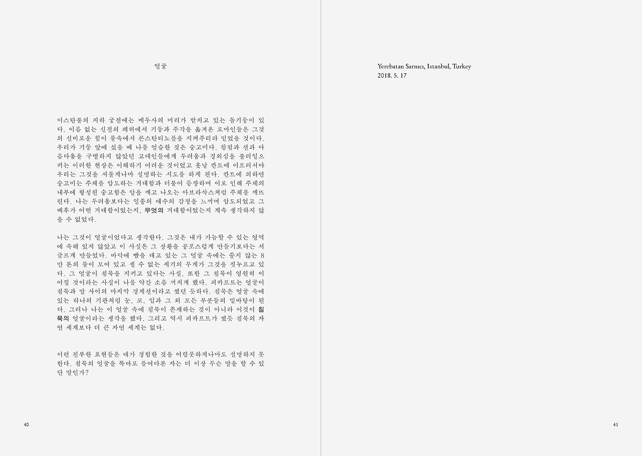 이스탄불의 지하 궁전에는 메두사의 머리가 받치고 있는 돌기둥이 있다. 이름 없는 신전의 폐허에서 기둥과 주각을 옮겨온 로마인들은 그것의 신비로운 힘이 물속에서 콘스탄티노플을 지켜주리라 믿었을 것이다. 우리가 기둥 앞에 섰을 때 나를 엄습한 것은 숭고미다. 참됨과 선과 아름다움을 구별하지 않았던 고대인들에게 두려움과 경외심을 불러일으키는 이러한 현상은 이해하기 어려운 것이었고 훗날 칸트에 이르러서야 우리는 그것을 서툴게나마 설명하는 시도를 하게 된다. 칸트에 의하면 숭고미는 주체를 압도하는 거대함과 더불어 등장하며 이로 인해 주체의 내부에 형성된 숭고함은 알을 깨고 나오는 아브라삭스처럼 주체를 깨뜨린다. 나는 두려움보다는 일종의 애수의 감정을 느끼며 압도되었고 그 배후가 어떤 거대함이었는지, 무엇의 거대함이었는지 계속 생각하지 않을 수 없었다.