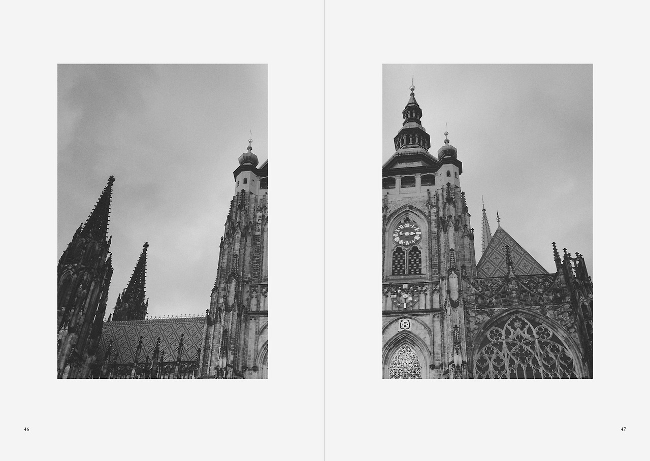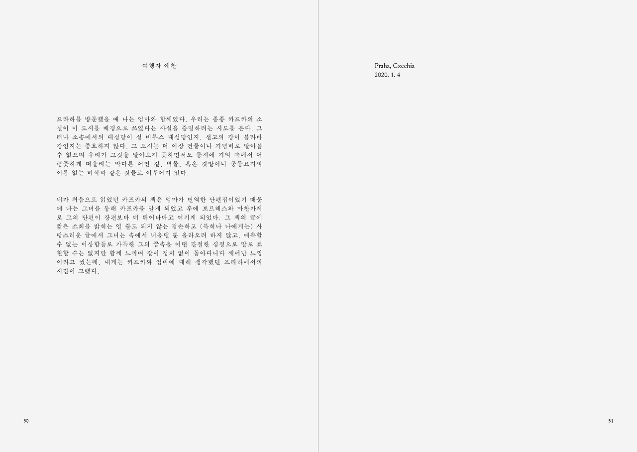 프라하를 방문했을 때 나는 엄마와 함께였다. 우리는 종종 카프카의 소설이 이 도시를 배경으로 쓰였다는 사실을 증명하려는 시도를 본다. 그러나 소송에서의 대성당이 성 비투스 대성당인지, 선고의 강이 블타바강인지는 중요하지 않다. 그 도시는 더 이상 건물이나 기념비로 알아볼 수 없으며 우리가 그것을 알아보지 못하면서도 동시에 기억 속에서 어렴풋하게 떠올리는 막다른 어떤 길, 벽돌, 혹은 깃발이나 공동묘지의 이름 없는 비석과 같은 것들로 이루어져 있다.