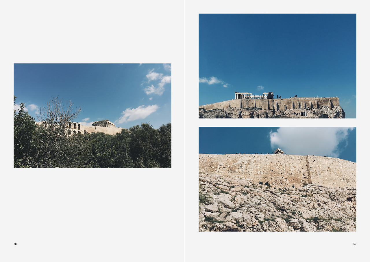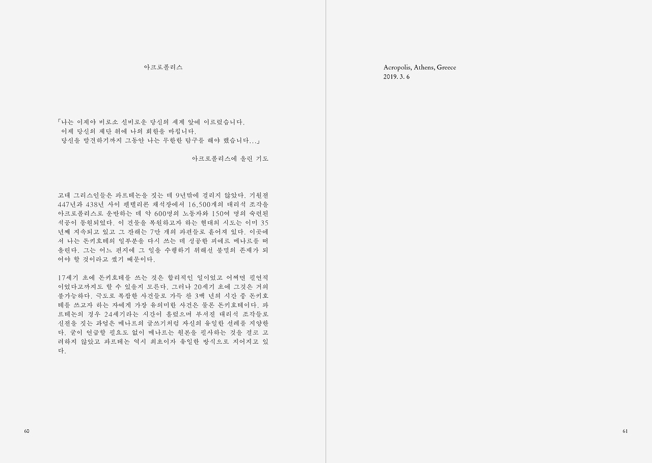 고대 그리스인들은 파르테논을 짓는 데 9년밖에 걸리지 않았다. 기원전 447년과 438년 사이 펜텔리콘 채석장에서 16,500개의 대리석 조각을 아크로폴리스로 운반하는 데 약 600명의 노동자와 150여 명의 숙련된 석공이 동원되었다. 이 건물을 복원하고자 하는 현대의 시도는 이미 35년째 지속되고 있고 그 잔해는 7만 개의 파편들로 흩어져 있다. 이곳에서 나는 돈키호테의 일부분을 다시 쓰는 데 성공한 피에르 메나르를 떠올린다. 그는 어느 편지에 그 일을 수행하기 위해선 불멸의 존재가 되어야 할 것이라고 썼기 때문이다.