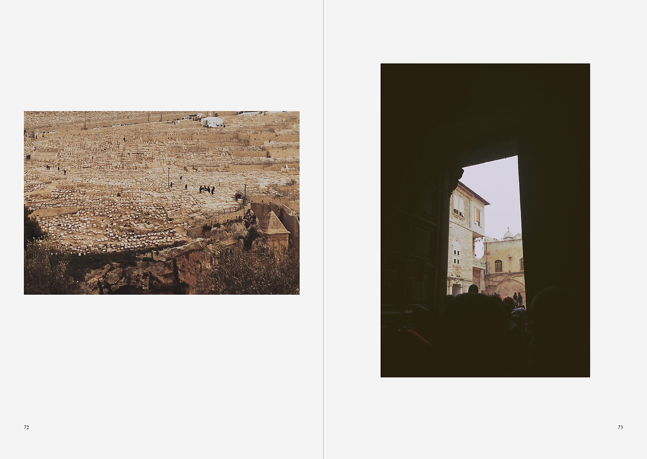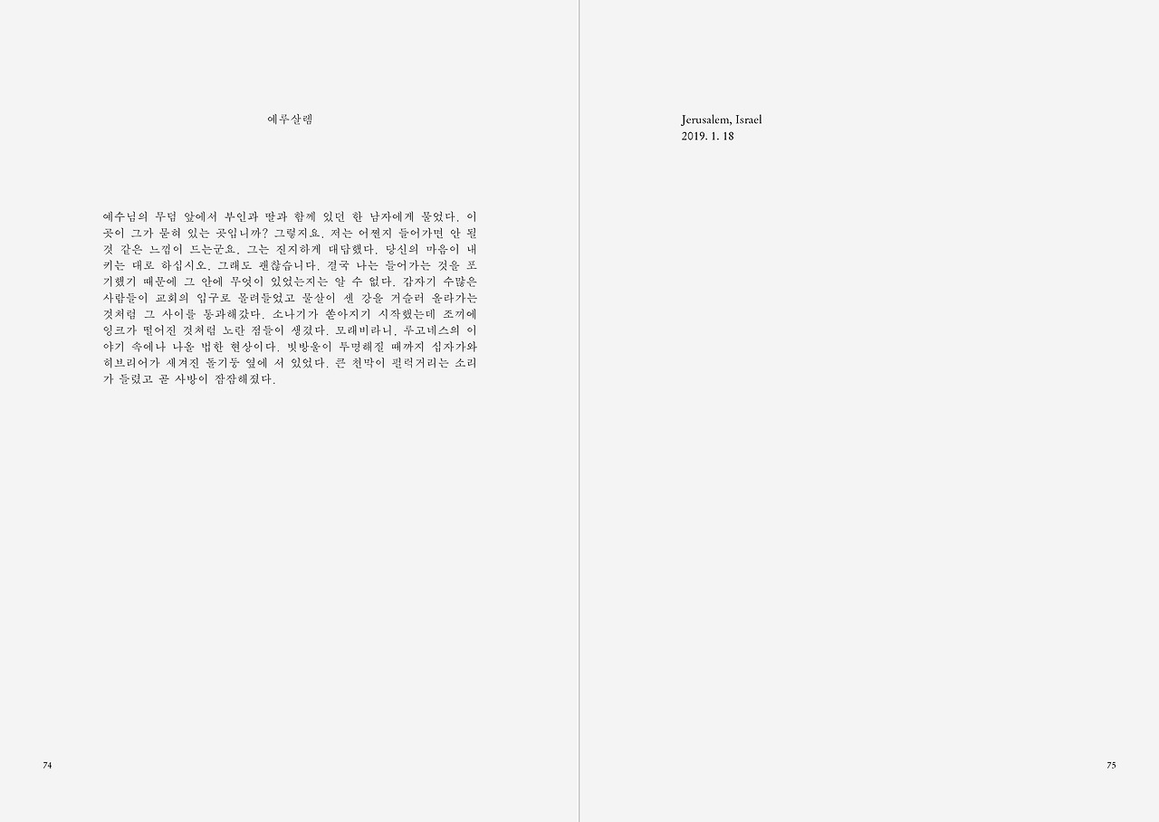 예수님의 무덤 앞에서 부인과 딸과 함께 있던 한 남자에게 물었다. 이곳이 그가 묻혀 있는 곳입니까? 그렇지요. 저는 어쩐지 들어가면 안 될 것 같은 느낌이 드는군요. 그는 진지하게 대답했다. 당신의 마음이 내키는 대로 하십시오. 그래도 괜찮습니다. 결국 나는 들어가는 것을 포기했기 때문에 그 안에 무엇이 있었는지는 알 수 없다. 갑자기 수많은 사람들이 교회의 입구로 몰려들었고 물살이 센 강을 거슬러 올라가는 것처럼 그 사이를 통과해갔다. 소나기가 쏟아지기 시작했는데 조끼에 잉크가 떨어진 것처럼 노란 점들이 생겼다. 모래비라니, 루고네스의 이야기 속에나 나올 법한 현상이다. 빗방울이 투명해질 때까지 십자가와 히브리어가 새겨진 돌기둥 옆에 서 있었다. 큰 천막이 펄럭거리는 소리가 들렸고 곧 사방이 잠잠해졌다.