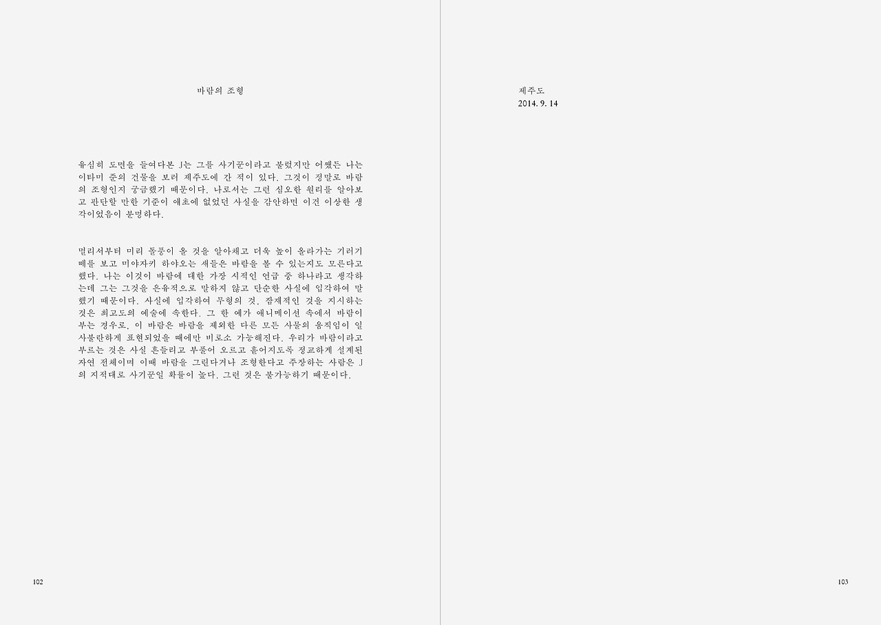 유심히 도면을 들여다본 J는 그를 사기꾼이라고 불렀지만 어쨌든 나는 이타미 준의 건물을 보러 제주도에 간 적이 있다. 그것이 정말로 바람의 조형인지 궁금했기 때문이다. 나로서는 그런 심오한 원리를 알아보고 판단할 만한 기준이 애초에 없었던 사실을 감안하면 이건 이상한 생각이었음이 분명하다.