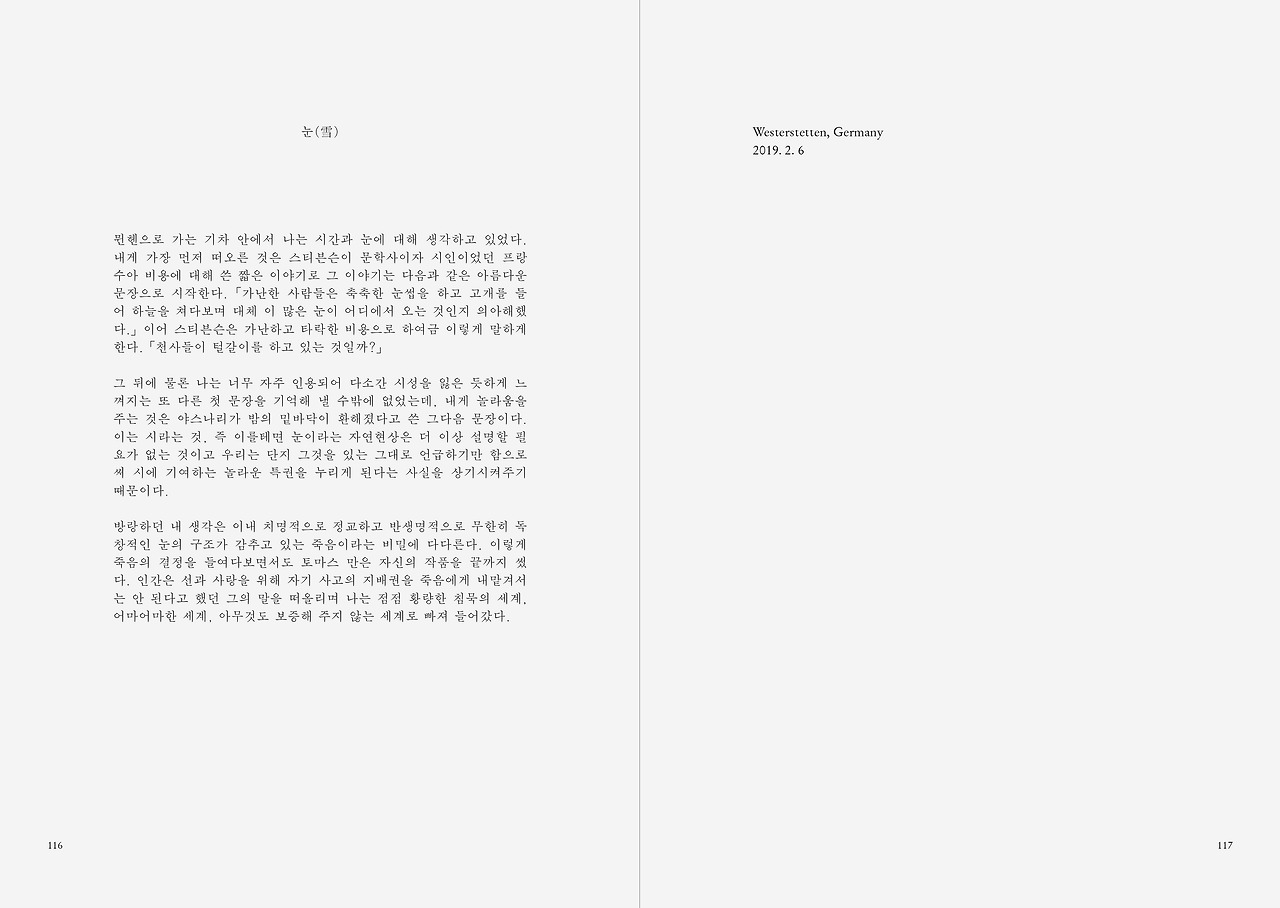 방랑하던 내 생각은 이내 치명적으로 정교하고 반생명적으로 무한히 독창적인 눈의 구조가 감추고 있는 죽음이라는 비밀에 다다른다. 이렇게 죽음의 결정을 들여다보면서도 토마스 만은 자신의 작품을 끝까지 썼다. 인간은 선과 사랑을 위해 자기 사고의 지배권을 죽음에게 내맡겨서는 안 된다고 했던 그의 말을 떠올리며 나는 점점 황량한 침묵의 세계, 어마어마한 세계, 아무것도 보증해 주지 않는 세계로 빠져 들어갔다.
