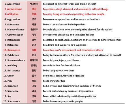 빨간색으로 표시된 성취, 친애 및 지배욕구는 Winter와 그의 동료들이 Murray의 목표 목록 중 기초가 되는 기본적 차원이라 언급한 욕구들이며, 이에 더해 McClelland, Atkinson을 비롯한 다른 연구자들 또한 초점을 두어 역설한 중심 욕구이다.