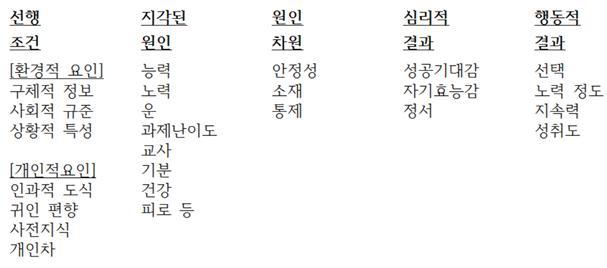 환경적 요인과 개인적 요인이라는 두 선행조건의 귀인 요인에 의해 원인이 지각되고, 지각된 원인들은 세 가지 차원에 의해 달리 분류되어진다. 이러한 원인 차원의 특성에 따라 효능감과 정서에 다른 영향을 주게 되고, 이에 따라 자신의 행동적 결과, 즉 어떤 행동을 선택할지, 그 행동에 얼마의 노력을 기울일지, 그 노력을 얼마나 지속할지 그리고 어느 정도의 성취를 이룰 수 있을지를 결정하게 되는 것이다.