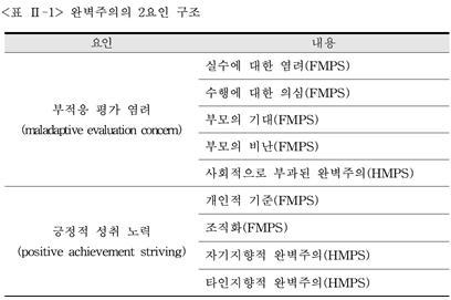 마찬가지로 다차원 척도(FMPS)를 도입한 Frost와 동료들의 93년도 논문에서는 FMPS와 HMPS를 분석하여 완벽주의의 요인들을 정리했다. 그 내용은 다음과 같다.