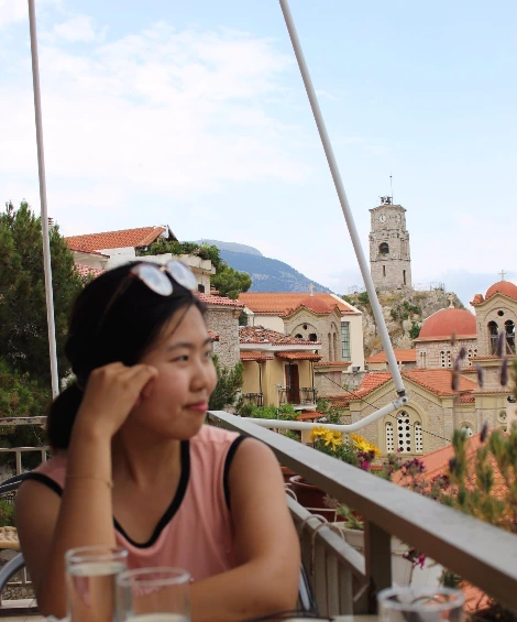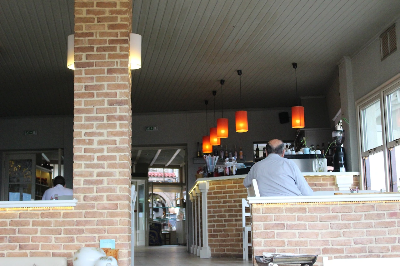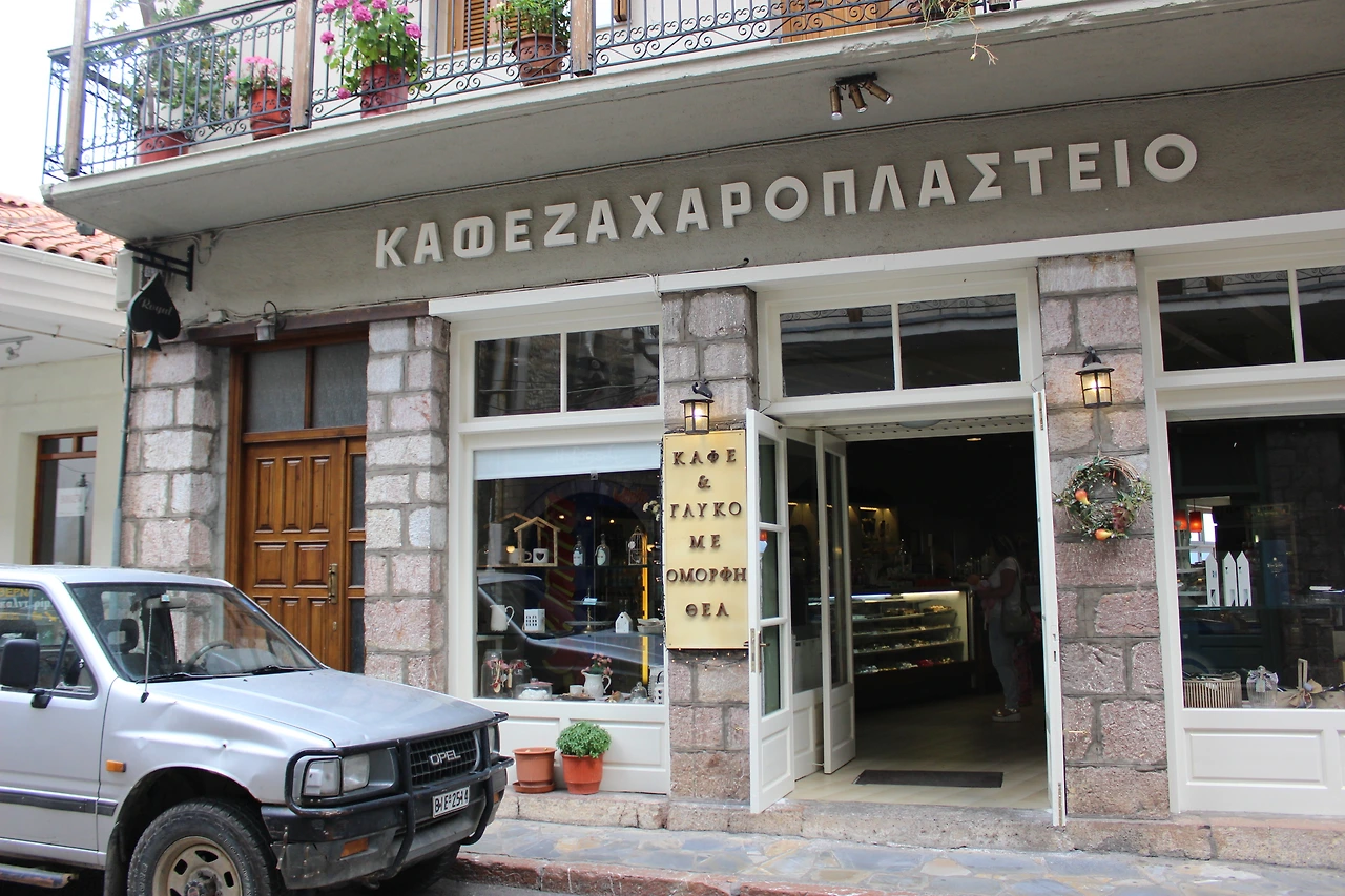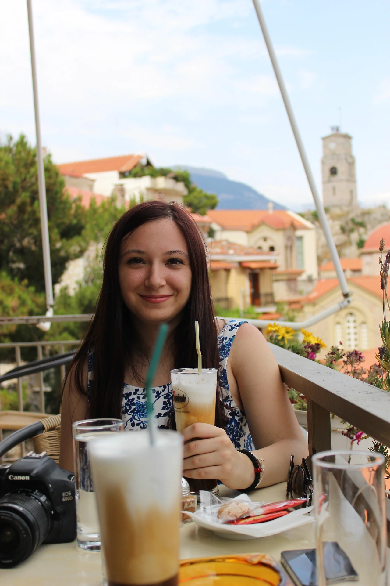 마을의 시내 거리를 걸으며 만난 한 카페. 우연히 들어선다. 우연의 선물 치고는 너무 멋진 전경. 이럴 때 빠질 수 없는 인승샷과 그리스 커피 '프레도 카푸치노(Freddo Cappuccino)'. 프레도 카푸치노는 중간 정도의 단 맛(그리스어로 μέτριο (메트리오))으로 마실 때가 제일 맛있으므로 그리스어로 멋지게 "Freddo Cappuccino, μέτριο, παρακαλώ(프레도 카푸치노 메트리오 빠라갈로)" 주문 완료.
