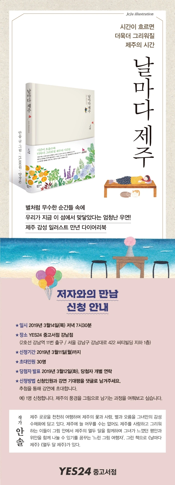 취미로 시작한 그림이 직업이 되기까지, 일러스트레이터라는 직업에 대해, 프리랜서로 살아가는 이야기, 책 출판에 대한 이야기, 제주살이에 대한 이야기 등 이런저런 이야기도 나누고 그동안 궁금하셨던 점에 대해 Q&A 시간도 가져보려 해요.
