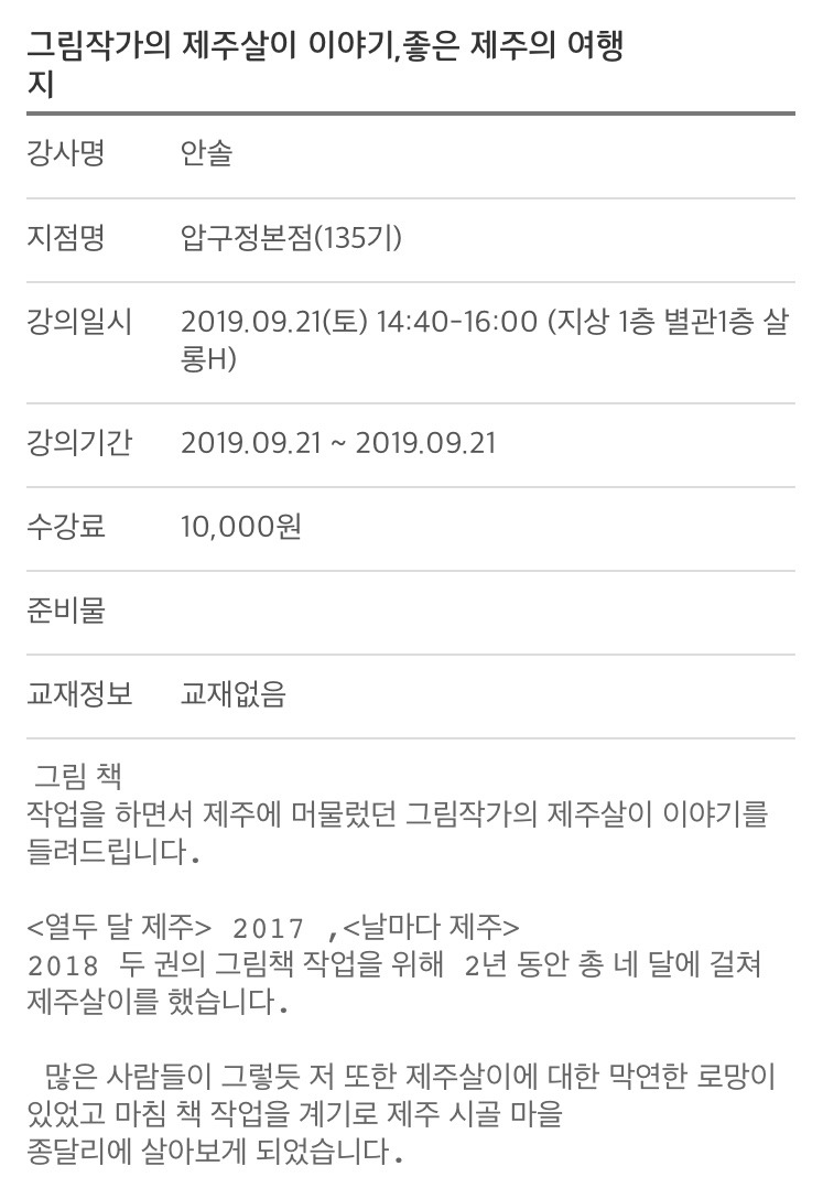 장소: 현대백화점 압구정본점 문화센터
