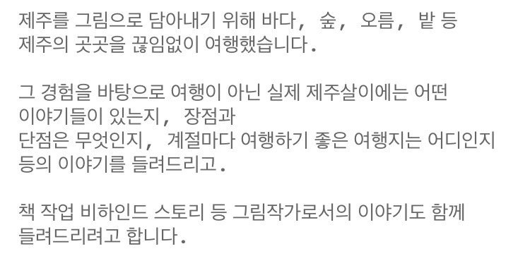 <그림작가의 제주살이> 라는 주제로 제주 이야기를 들려드립니다. 책 작업을 위해 제주살이를 하며 경험하고 느낀 것들, 책 출판 비하인드 스토리, 계절마다 여행하기 좋은 제주의 여행지 등의 이야기를 함께 나눌 예정입니다.