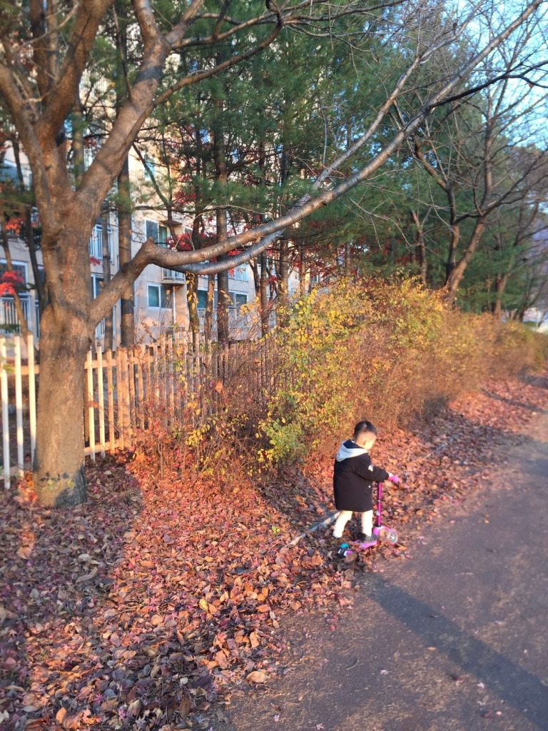 봄에는 산수유를 시작으로 목련 벚꽃 그리고 조팝나무까지 꽃들의 향연이 펼쳐진다. 한 여름에도 나무 숲이 그늘을 만들어주고 알록달록 장미꽃과 철쭉이 지고 가을이 되면 첫째가 좋아하는 놀잇감인 나뭇잎 천지가 된다.