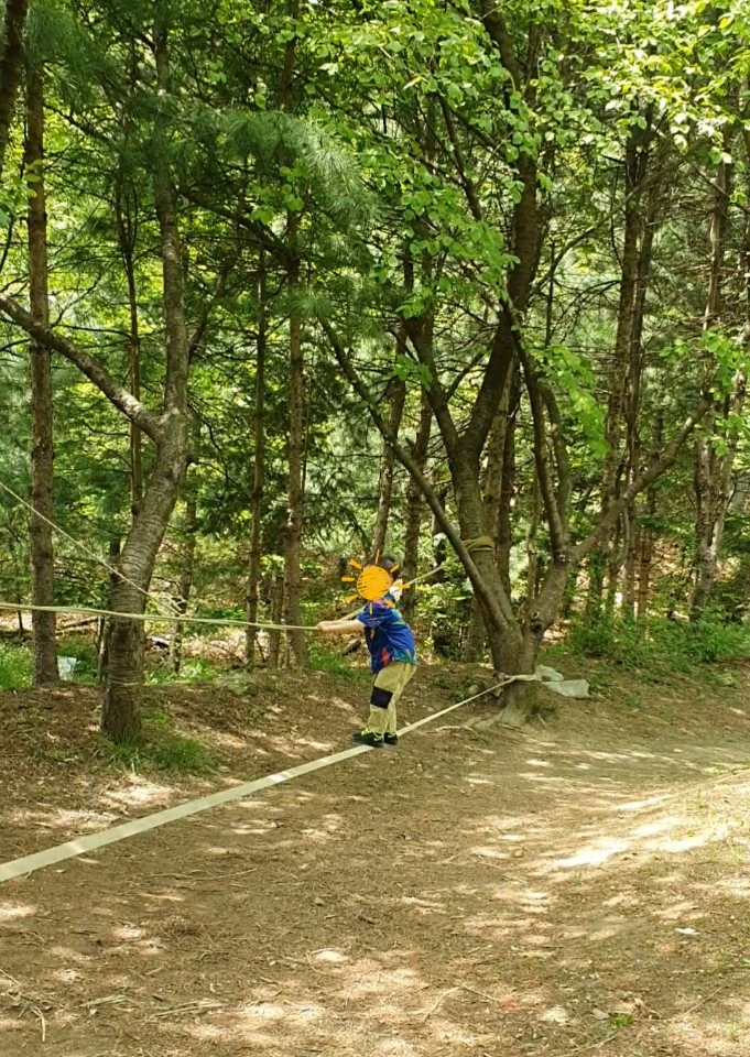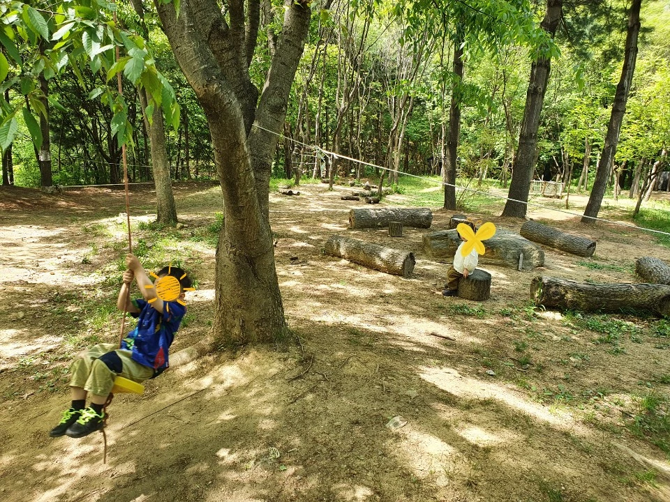 첫째가 생각하는 교실과 늘 봐오던 놀이터랑은 달리 밧줄과 통나무들이 거의 전부인 숲 한가운데 있는 숲교실이 첫째는 익숙하지 않은지 호기심도 길게 이어지지 못하고 계속 노는 흐름이 끊겼다.