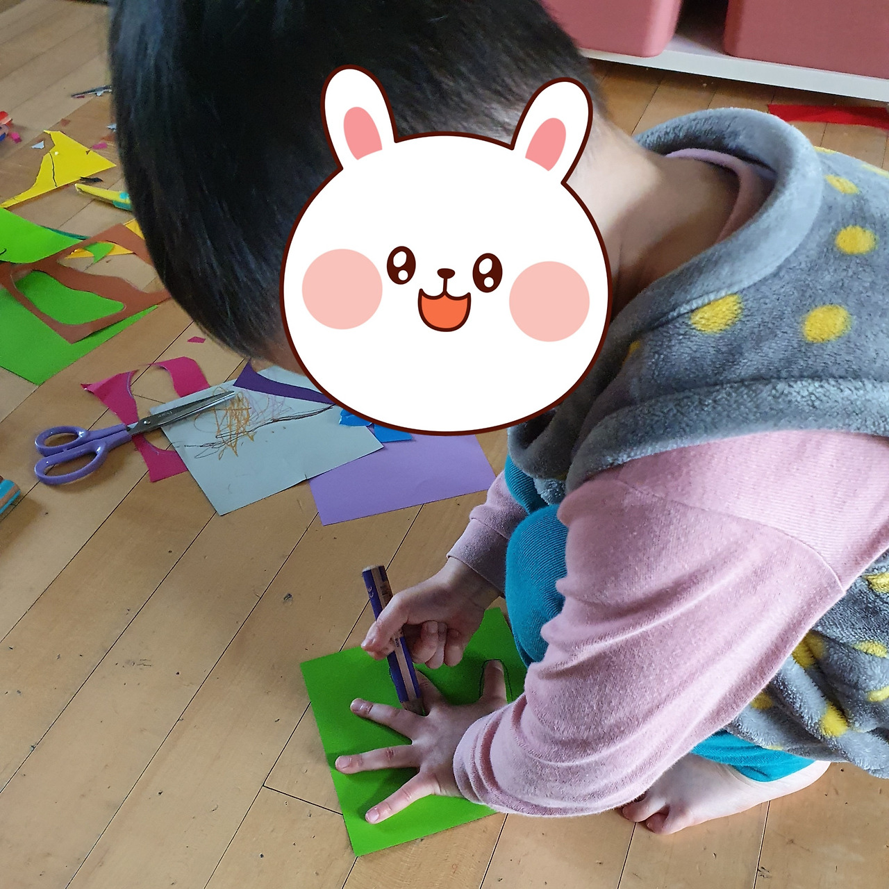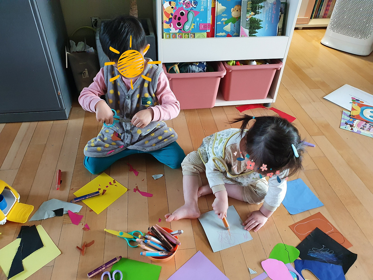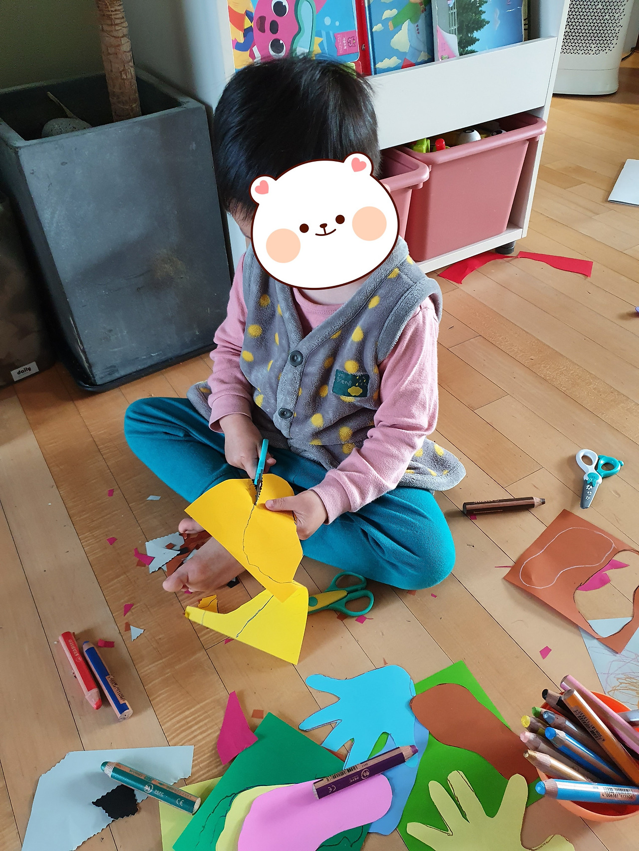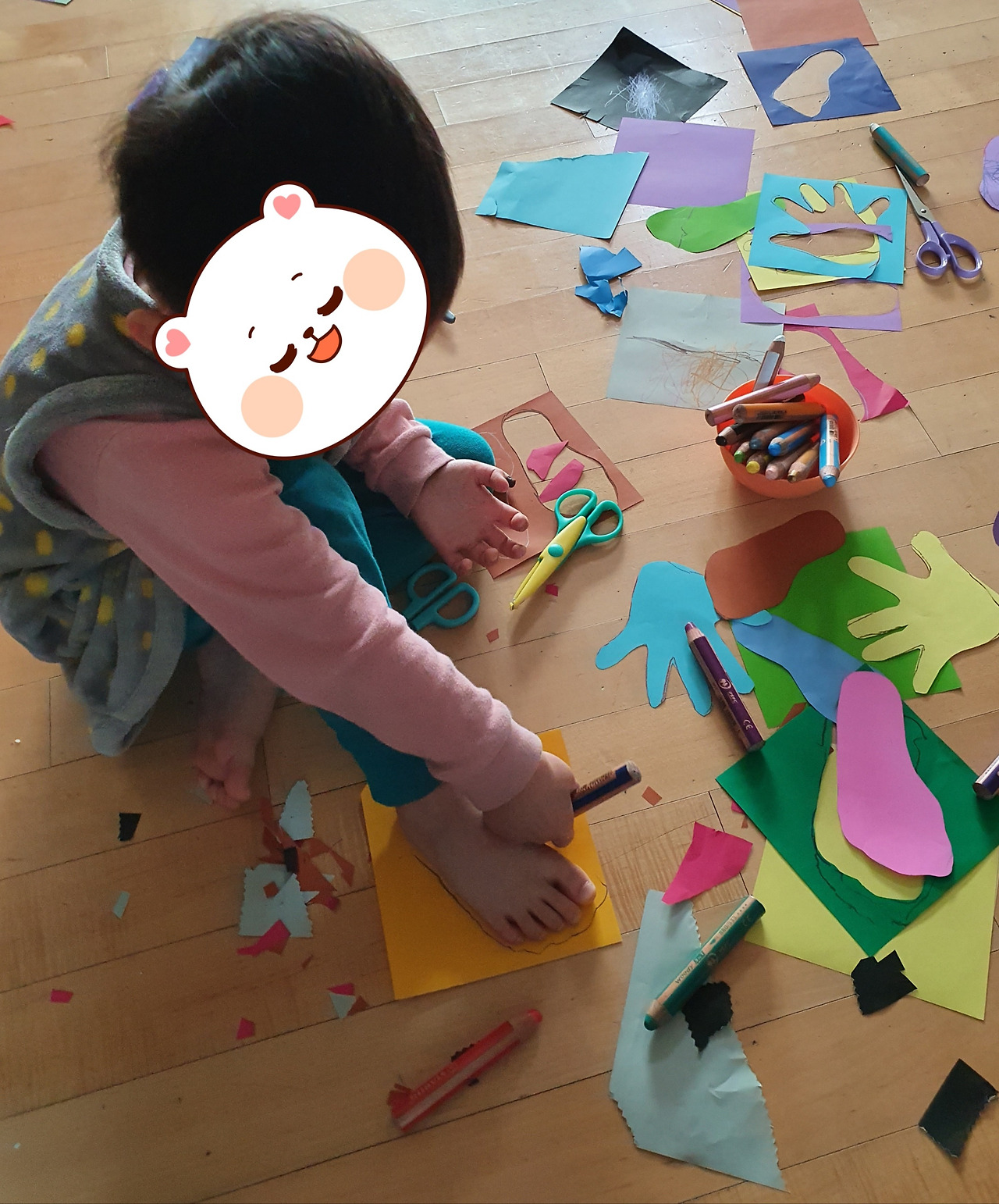 자유롭게 색종이에 그림을 그리고 놀다가 자연스럽게 가위질로 이어지고 손바닥 발바닥 종이 배열을 달리하며 매치하다 보면 몇 시간이 뚝딱 흘러간다.