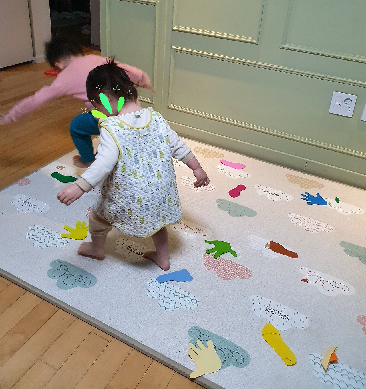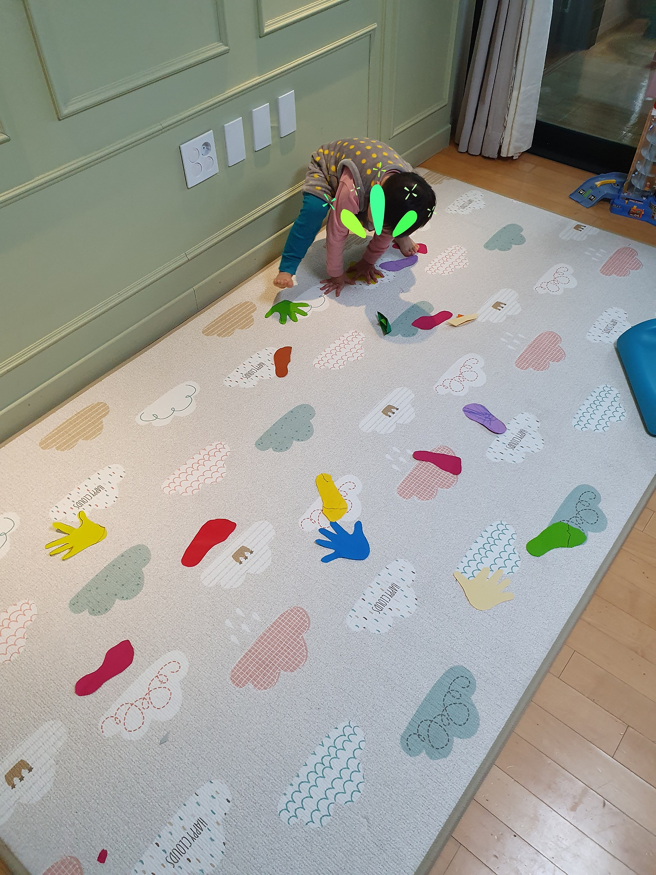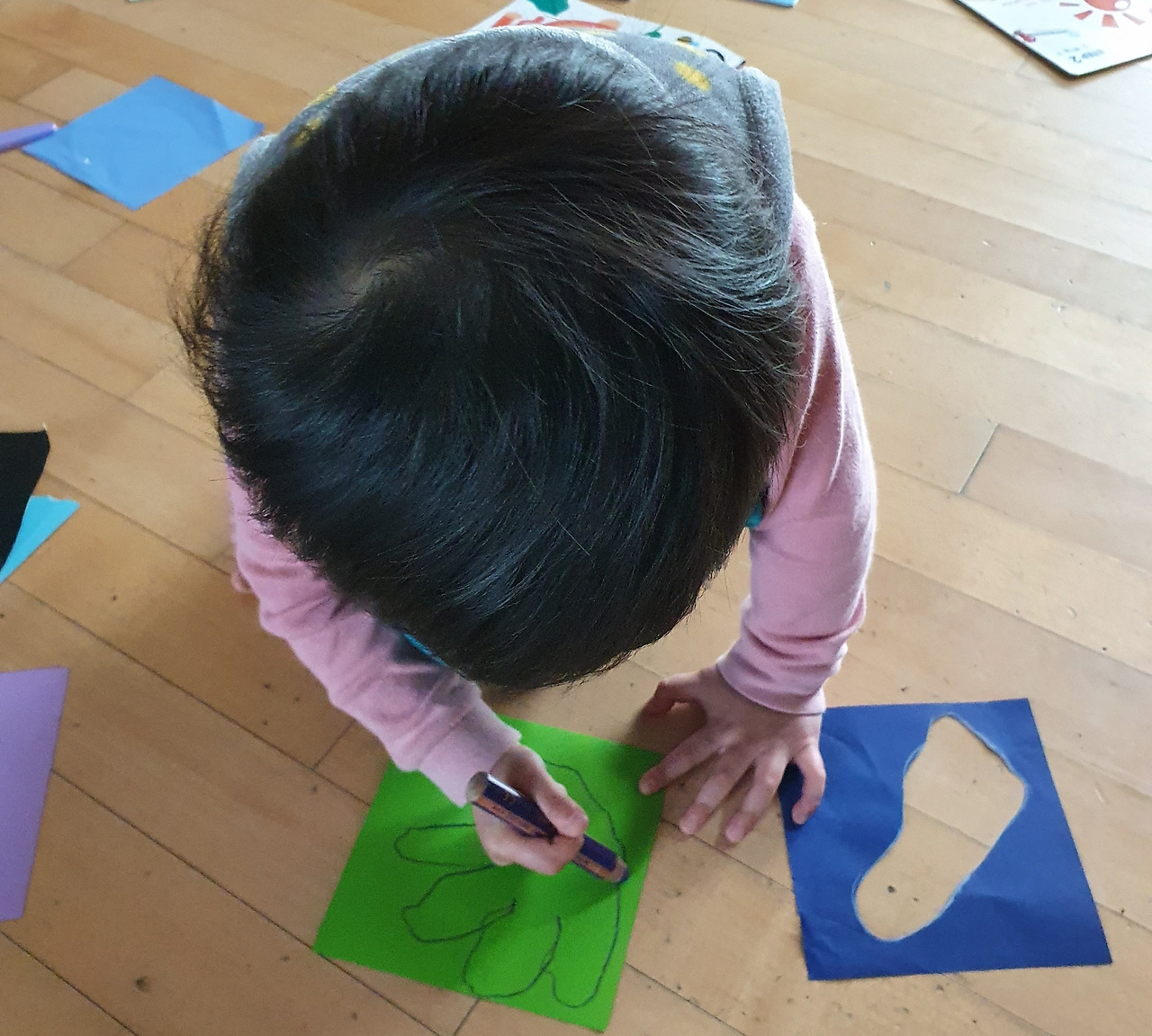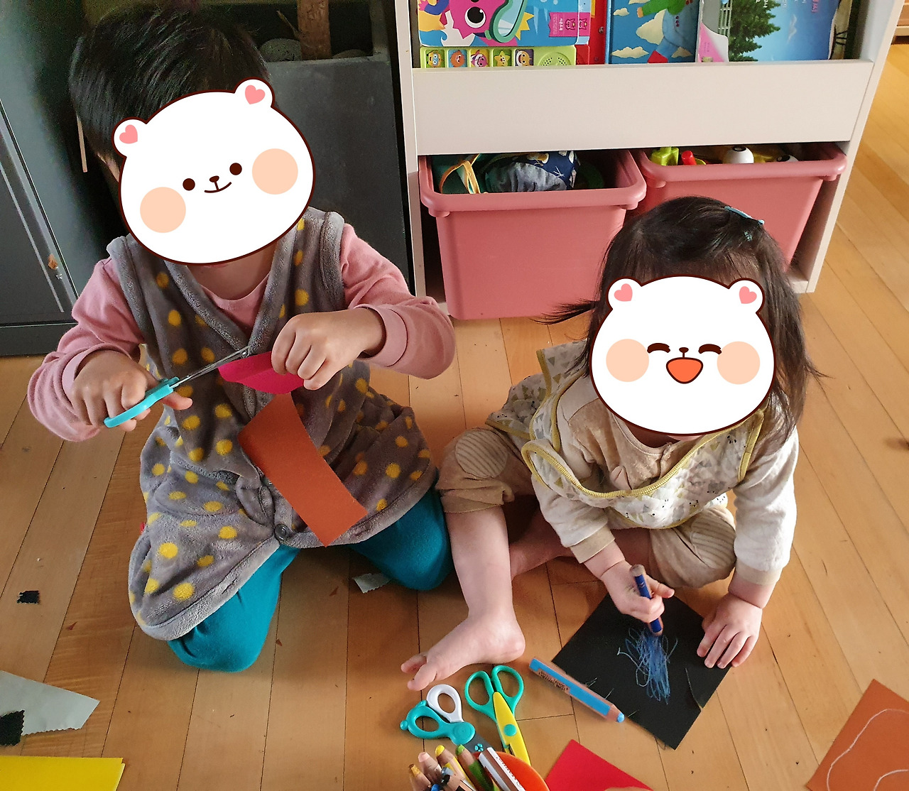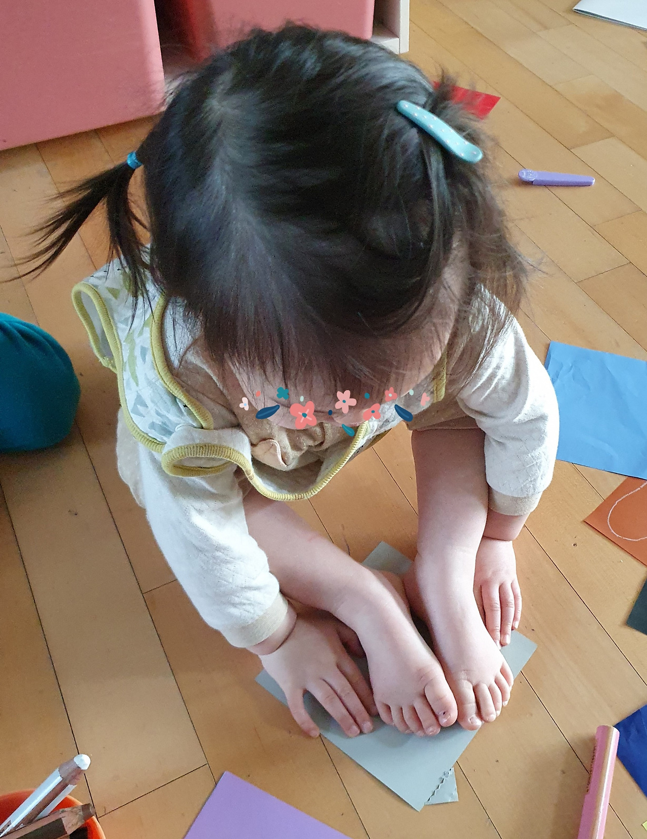 자유롭게 색종이에 그림을 그리고 놀다가 자연스럽게 가위질로 이어지고 손바닥 발바닥 종이 배열을 달리하며 매치하다 보면 몇 시간이 뚝딱 흘러간다.
