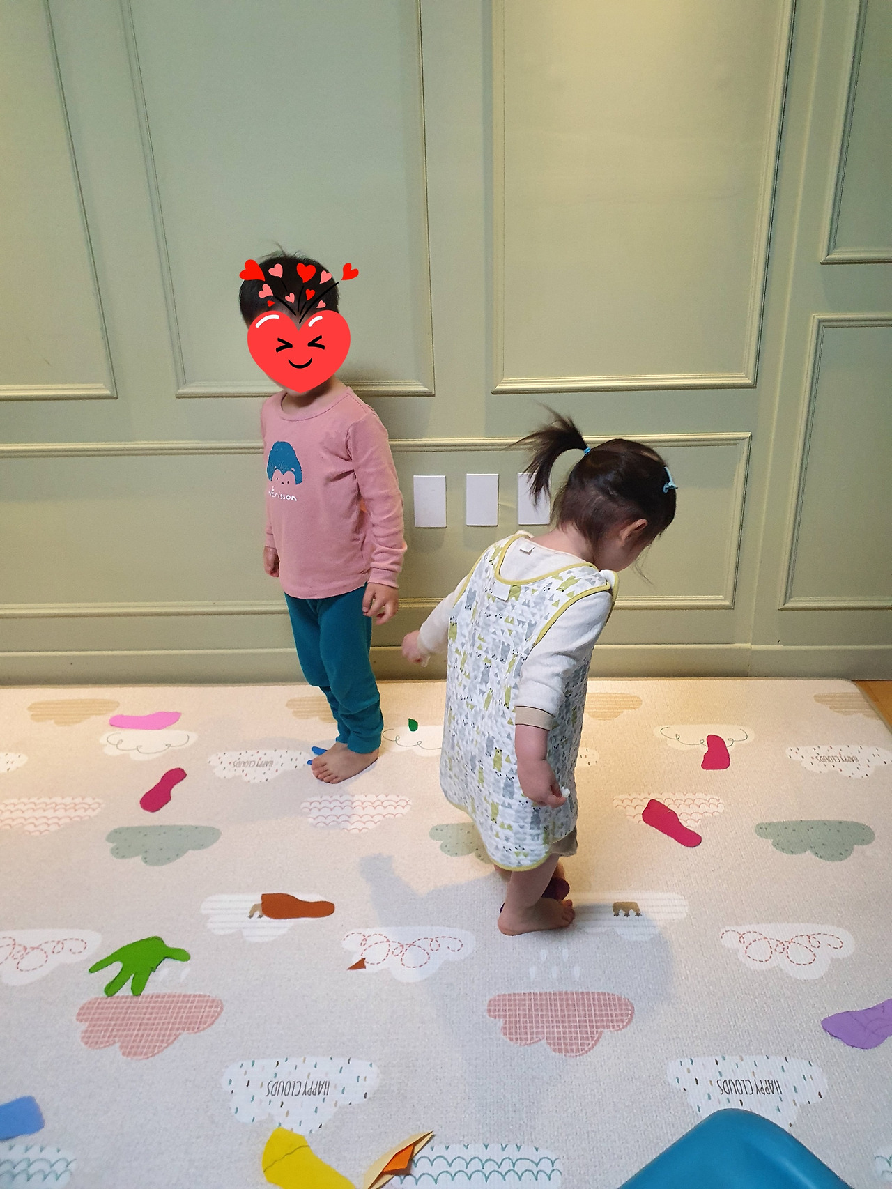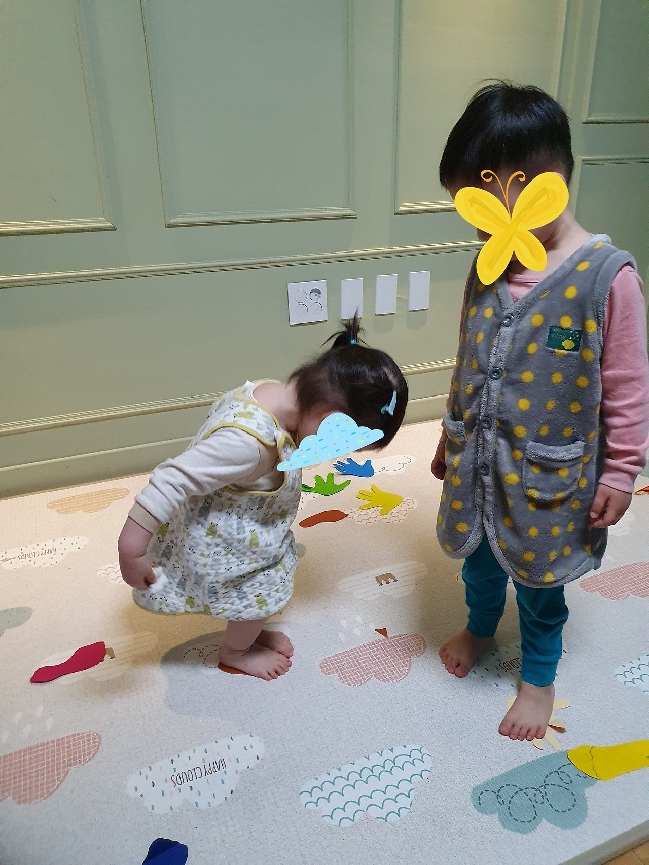 둘째는 아직 어려서 잘 못하지만 그래도 둘이 경주하는 시늉을 내거나 시간을 재는 듯 빨리하도록 부추기면 급한 마음에 손바닥 발바닥을 잘못짚는데,