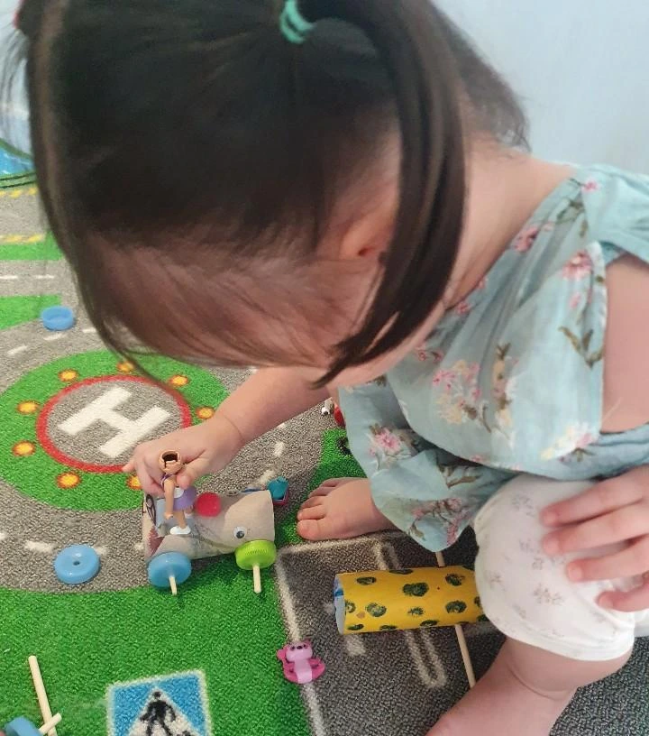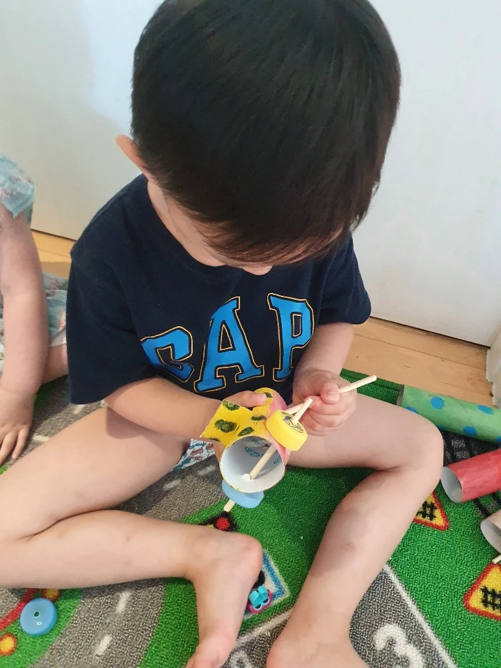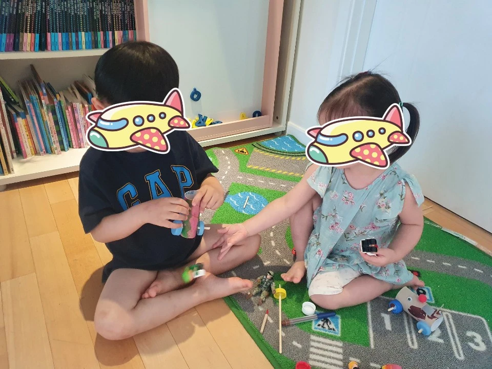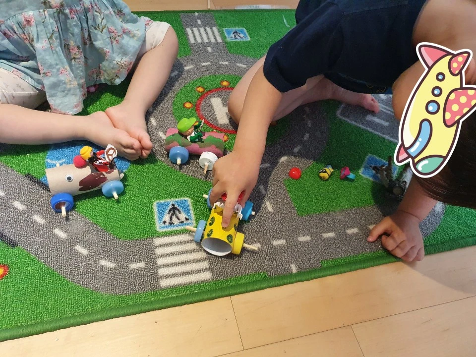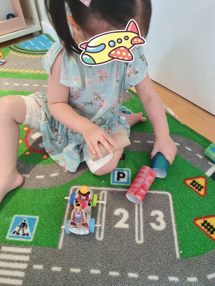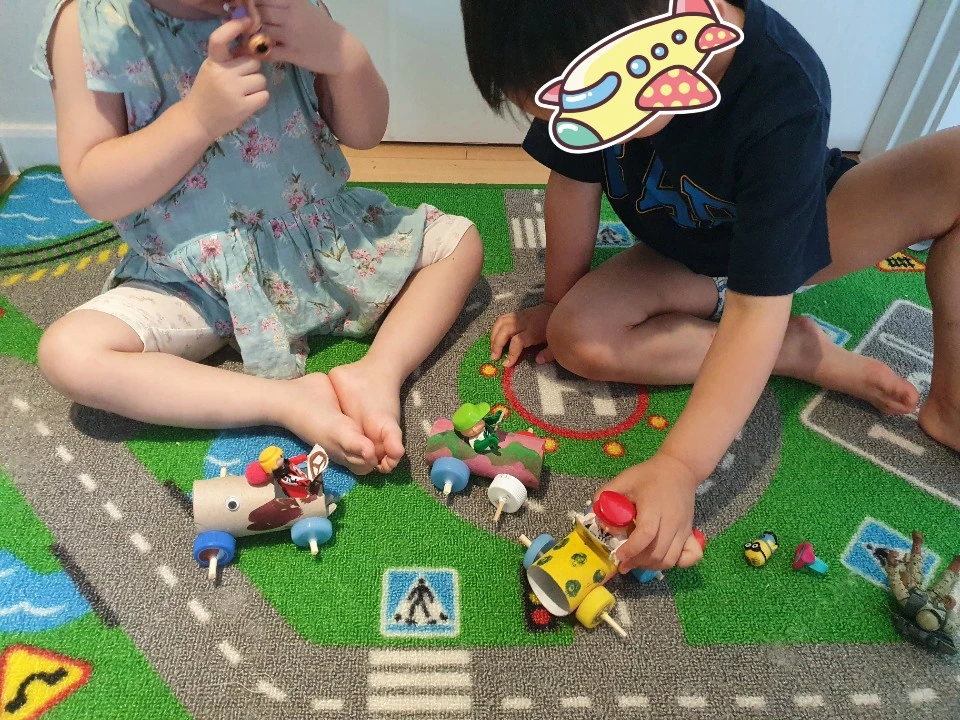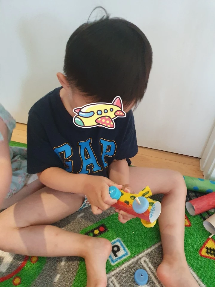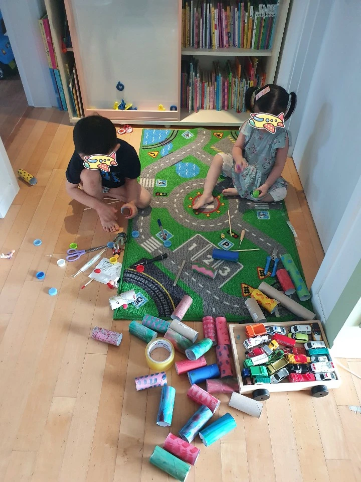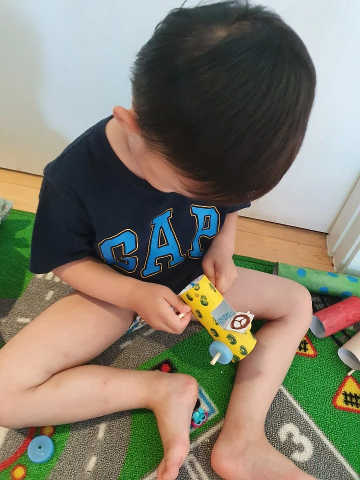간간히 미술 놀이할 때 색칠도 해놓은 휴지심으로 구멍을 뚫어 나무젓가락을 연결해 페트병 뚜껑 바퀴를 달아 자동차를 만드는 건 첫째가 제일 좋아했다.
