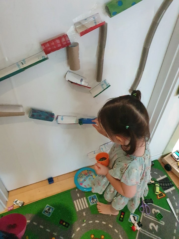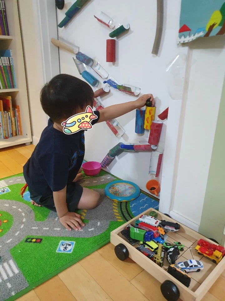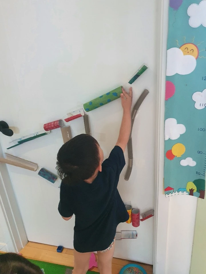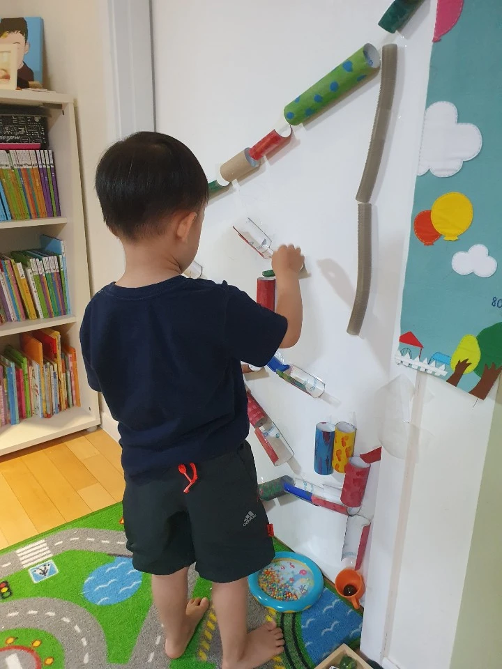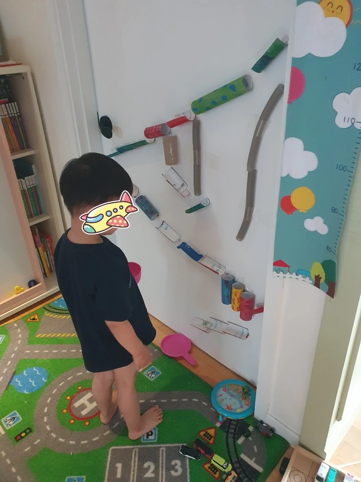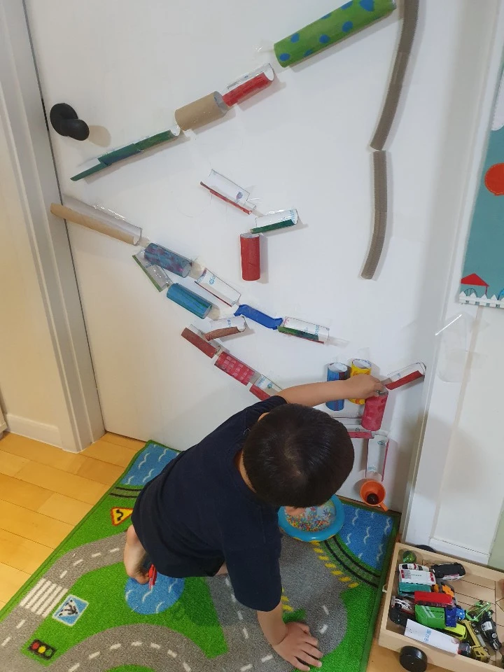 다음엔 방문에 휴지심들을 붙여 미니카 겸 구슬 슬라이드를 만들었는데 그렇게나 반복해서 구슬을 넣고 한참을 바라볼 줄이야...