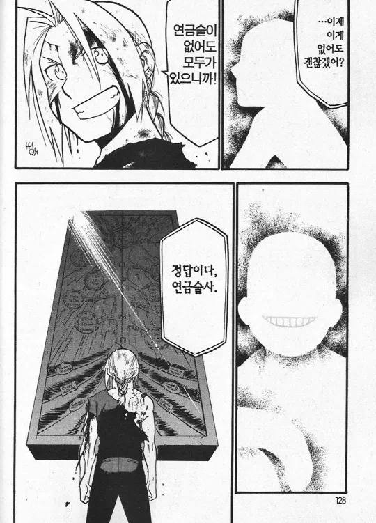 대사 하나하나의 철학적 질문과 액션, 감정선이 절묘한 조화를 이루는 데다가, 개그와 드라마도 적절하고 질질 끌지도 않는데, 애니와 만화, 심지어 2003년판 구강철과 브라더후드(원작 충실)의 결말 둘 다 짜임새가 대단하다. 언제 봐도 감탄할 수밖에 없는 작품이지.