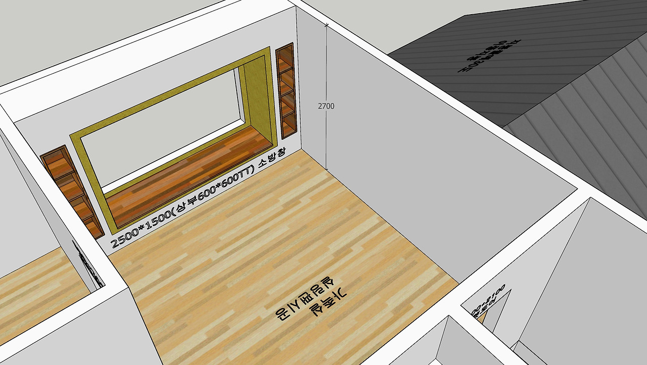 기역자 큰 창문과 선반을 덧붙였다. 남편이 이곳에서 음악도 듣고, 기타도 친다고 한다. 상상력이 요구되는 방이다. 처음에는 포치로 하려 했다. 그런데 그 쓰임새에 있어서 로망일뿐, 현실에서는 효용가치가 떨어질듯했다. 특히, 나의 일상은 거의 1층에서 이루어지는 거을 감안한다면 손님이나 남편의 공간으로 방이 나을 듯했다.