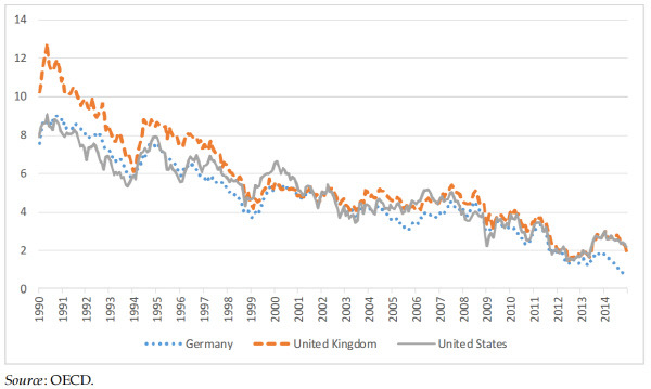 1990년 이후 주요국의 장기 금리 변화 추이. 출처:다니엘 그로스의 양적완화에 따른 이자율 변화에 관한 논문(https://www.ceps.eu/system/files/WD416%20Did%20QE%20affect%20interest%20rates_0.pdf)