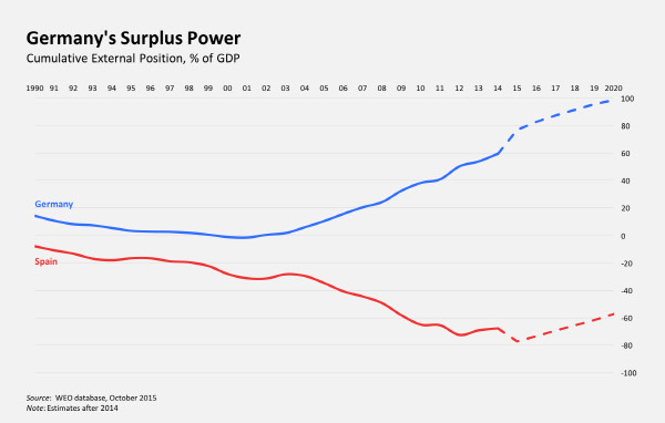 금융위기 시작 이후 독일의 경상수지 흑자는 거의 GDP의 8%까지 증가했다. 독일이 이전 시기 거두었던 경상수지를 합한 것보다 많은 흑자를 본 것으로 현재 추세가 계속되면 독일의 채권 포지션은 GDP의 60%에서 GDP의 100%로 커지게 된다. 출처:http://www.project-syndicate.org/commentary/futility-of-quantitative-easing-in-japan-and-eurozone-by-daniel-gros-2016-02