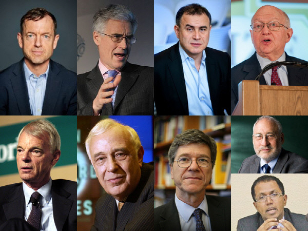 왼쪽 위부터 시계 방향으로 다니엘 그로스 유럽정책연구센터 소장, 아다이르 터너 전 영국 금융감독청 청장, 누리엘 루비니 뉴욕대 교수, 마틴 펠드스타인 하버드대 교수, 조지프 스티글리츠 컬럼비아대 교수, 하미드 라시드 UNDP 상임 고문, 제프리 삭스 컬럼비아대 교수, 로버트 스키델스키 영국 워릭대 명예교수, 마이클 스펜스 뉴욕대 교수