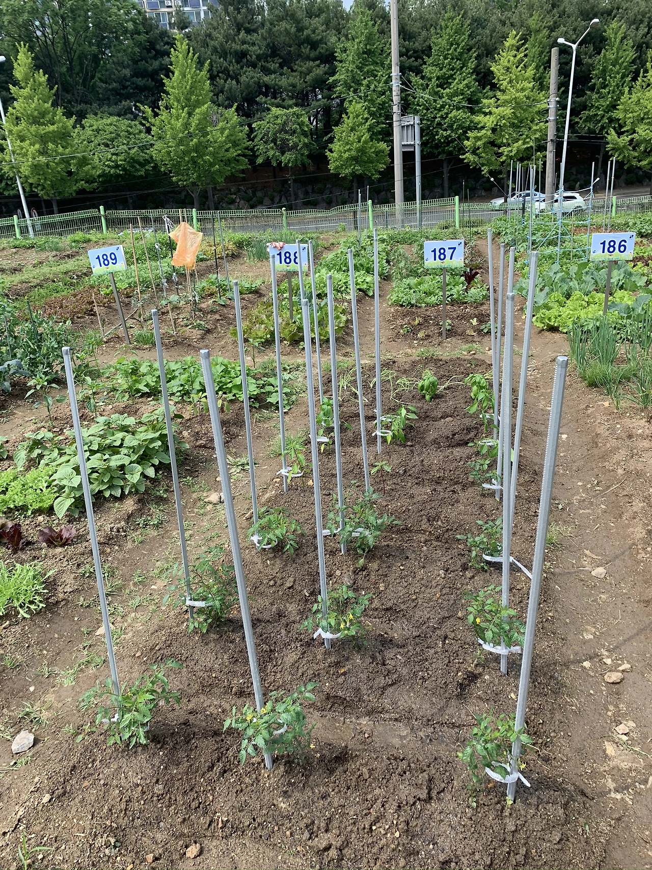 지난번 왔을 때 심었던 토마토, 고추에 지지대도 세웠다. 전날 비가 와 땅이 물러 작업하기 편했다. 뿌리가 다치지 않도록 줄기에서 10cm 떨어진 곳에 심고, 줄기와 지지대를 끈으로 묶었다. 모종을 심은 후 10일~15일 사이에 지지대를 세워주는데 120cm짜리가 딱 적당했다. (한 달 뒤 150cm 짜리도 샀는데, 트렁크에 들어가지 않아 난감했다.)