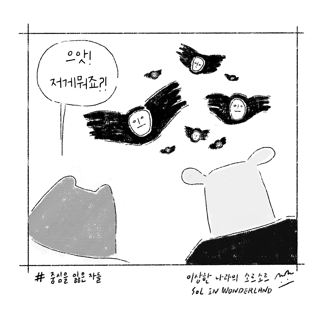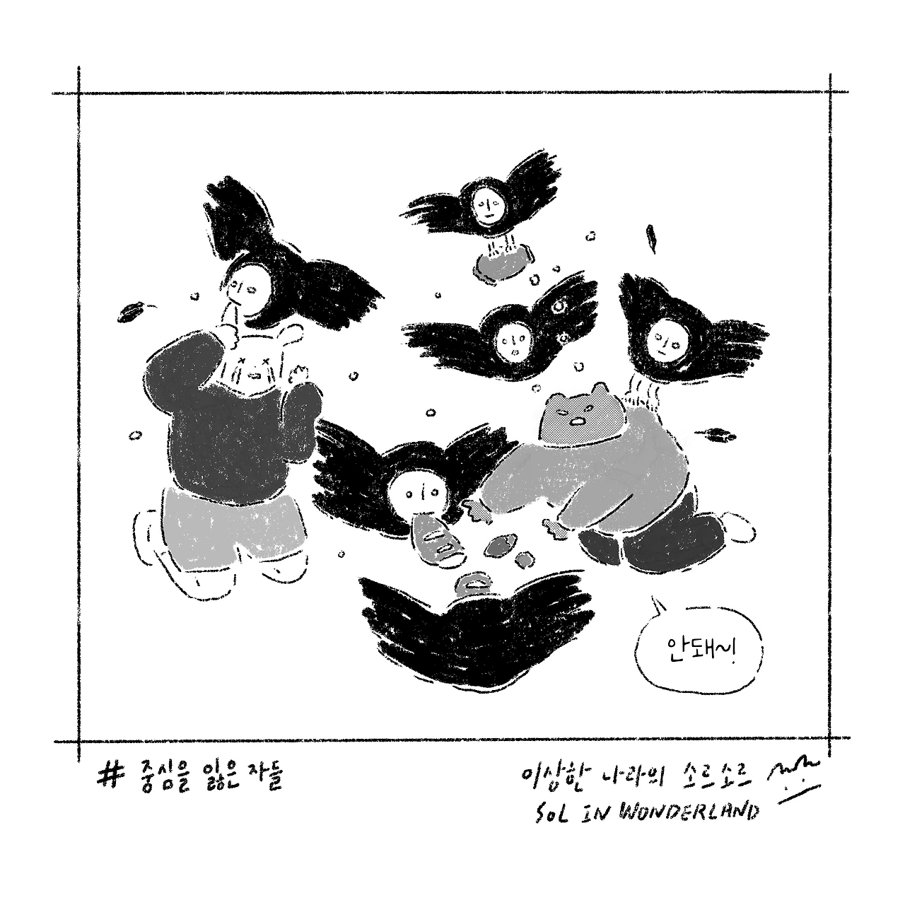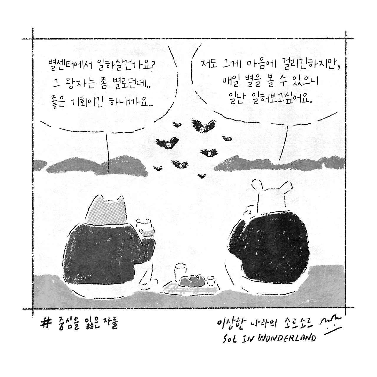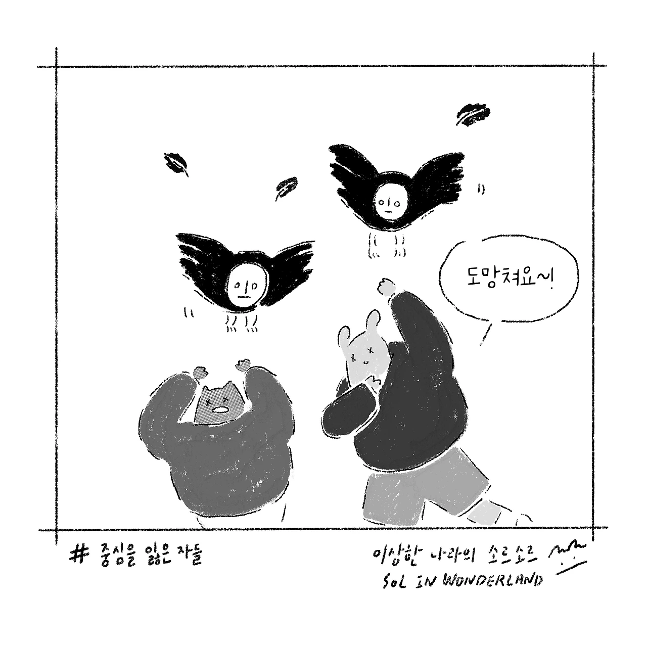 잠깐 쉬려고 앉은 혀니와 소르, 검고 창백한 얼굴을 한 새떼의 습격으로 간식을 모두 빼앗기고 마는데요.