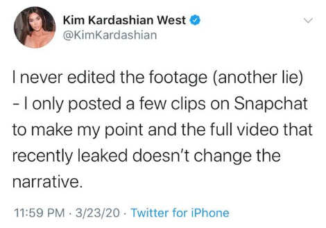 "난 영상 편집을 한 적이 없어. … 스냅챗에 몇 개의 클립만 올렸을 뿐이지. 전체 내용을 바꾼 적이 없어." 킴 카다시안 曰
